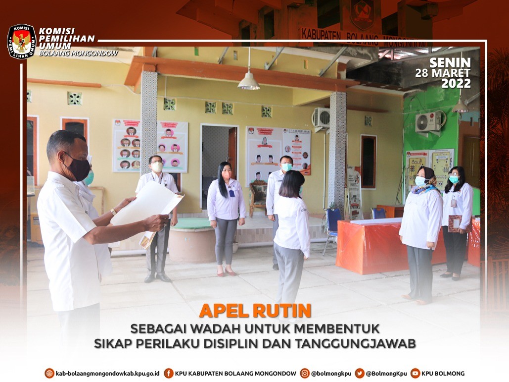 Lolak, kab-bolaangmongondow.kpu.go.id - Ketua KPU Kabupaten Bolaang Mongondow, Lilik Mahmudah, pagi tadi menjadi Pembina Apel Pagi (28/3). Kegiatan rutin ini diikuti oleh pejabat dan pegawai di lingkungan KPU Bolmong. Dalam kesempatannya beliau memberikan arahan dan penekanan kepada seluruh jajarannya agar lebih memperhatikan keamanan, kebersihan dan kenyamanan kantor.