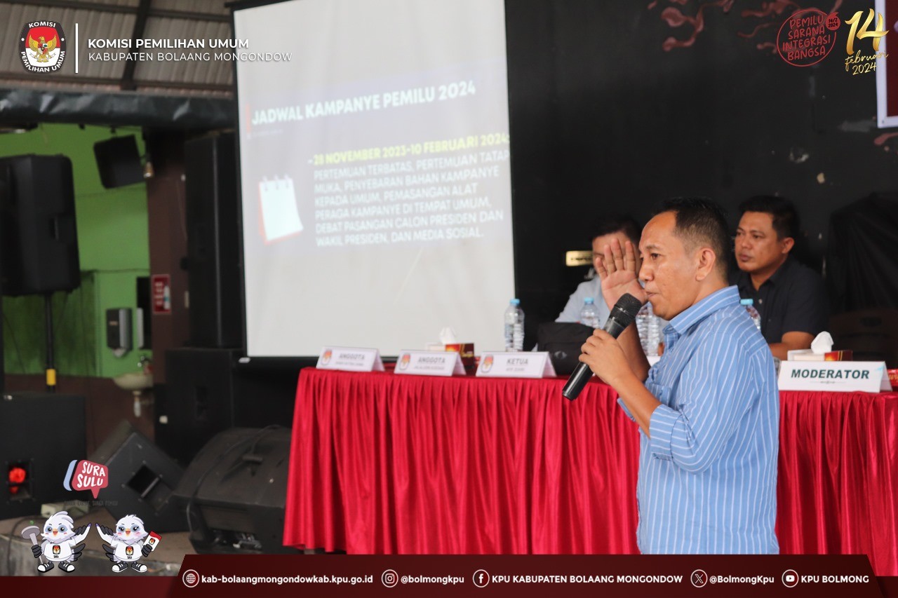 Ketua KPU Bolmong, Afif Zuhri, dalam sambutannya menyampaikan bahwa kegiatan ini merupakan bagian dari upaya KPU dalam rangka peningkatan partisipasi masyarakat dalam Pemilu 2024 mengingat organisasi kepemudaan memiliki ruang lingkup pengaruh yang cukup besar di masyarakat, sehingga beliau berharap para peserta yang hadir dapat menjadi perpanjangan tangan KPU dalam menyebarluaskan informasi kepemiluan, khususnya agar masyarakat dapat menggunakan hak pilihnya pada tanggal 14 Februari 2024 mendatang.