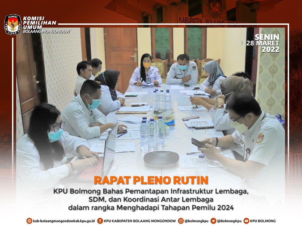 Lolak - kab-bolaangmongndow.kpu.go.id - Dalam rangka menjaga keberlangsungan pelaksanaan tugas dan fungsi sebagai Penyelenggara Pemilu dan Pemilihan, penyelenggaraan pemerintahan dan pelayanan publik, KPU Kabupaten Bolaang Mongondow secara rutin melaksanakan Rapat Pleno setiap minggunya.