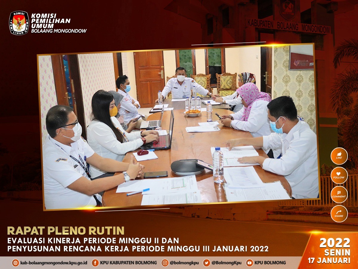Adapun agenda dalam rapat ini diawali dengan penyampaian dan reviu terhadap hasil rapat pleno minggu sebelumnya yang kemudian dilanjutkan dengan penyampaian laporan kerja mnggu II Januari dan rencana kerja minggu III Januari dari masing-masing divisi yang sebelumnya telah disusun oleh para Kasubag dan telah dikoordinasikan kepada masing-masing Ketua Divisi terkait. Laporan kerja dan rencana kerja yang telah dibahas dan ditetapkan dalam RPR ini menjadi dokumen resmi KPU Kabupaten Bolaang Mongondow yang dituangkan dalam Berita Acara Nomor 9/PK.01/7101/2022 tanggal 17 Januari 2022.