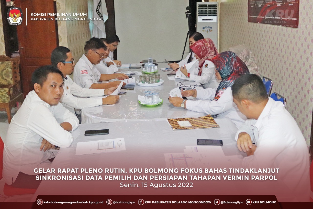 Agenda penting yang menjadi bahasan utama pleno ini adalah tentang tindak lanjut pencermatan dan sinkronisasi data Pemilih yang diturunkan dari KPU RI serta technical meeting persiapan pelaksanaan tahapan verifikasi administrasi partai politik calon peserta Pemilu yang akan dilaksanakan pada tanggal 16 Agustus 2022, serta agenda-agenda rutin lainnya. Di akhir rapat, Ketua KPU Bolmong, Lilik Mahmudah menyampaikan agar seluruh jajarannya mematangkan segala persiapan pelaksanaan tahapan verifikasi administrasi dimaksud.