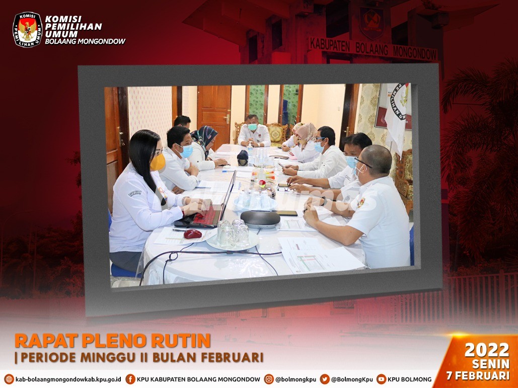 Lolak, Bolmong, kab-bolaangmongondow.kpu.go.id - Guna Pengambilan Kebijakan Rutin berdasarkan Pasal 60 Peraturan Komisi Pemilihan Umum Nomor 8 Tahun 2019 tentang Tata Kerja Komisi Pemilihan Umum, Komisi Pemilihan Umum Provinsi, dan Komisi Pemilihan Umum Kabupaten/Kota sebagaimana telah diubah dengan Peraturan Komisi Pemilihan Umum Nomor 4 Tahun 2021 tentang Perubahan Ketiga Atas Peraturan Komisi Pemilihan Umum Nomor 8 Tahun 2019 tentang Tata Kerja Komisi Pemilihan Umum, Komisi Pemilihan Umum Provinsi, dan Komisi Pemilihan Umum Kabupaten/Kota, maka Komisi Pemilihan Umum (KPU) Kabupaten Bolaang Mongondow melaksanakan Rapat Pleno Rutin pada hari Senin (7/2), sesuai dengan Surat Undangan Nomor 62/PK.01/7101/2022 tertanggal 4 Februari 2022 perihal undangan Rapat Pleno Rutin.