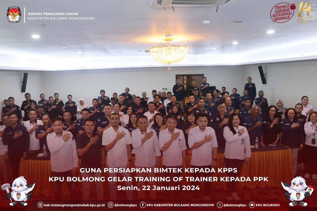 Lolak, kab-bolaangmongondow.kpu.go.id - Komisi Pemilihan Umum (KPU) Kabupaten Bolaang Mongondow (Bolmong) menggelar Training of Trainer (ToT) bagi Fasilitator Panitia Pemilihan Kecamatan (PPK) dalam Bimbingan Teknis Kelompok Penyelenggara Pemungutan Suara (KPPS) untuk Pemilu 2024, Senin (22/1/2024)