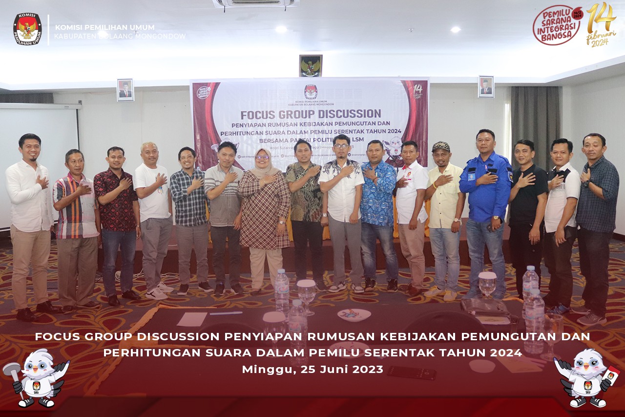Lolak, kab-bolaangmongondow.kpu.go.id - Minggu (25/6), Komisi Pemilihan Umum (KPU) Bolaang Mongondow menggelar Focus Group Discussion (FGD) terkait Penyiapan Rumusan Kebijakan Pemungutan Suara dan Perhitungan Suara dalam Pemilihan Umum Serentak Tahun 2024 bersama Partai Politik Peserta Pemilu dan Lembaga Swadaya Masyarakat (LSM) yang membidangi kepemiluan, di Hotel Sutanraja, Kota Kotamobagu, Minggu (25/06/2023).