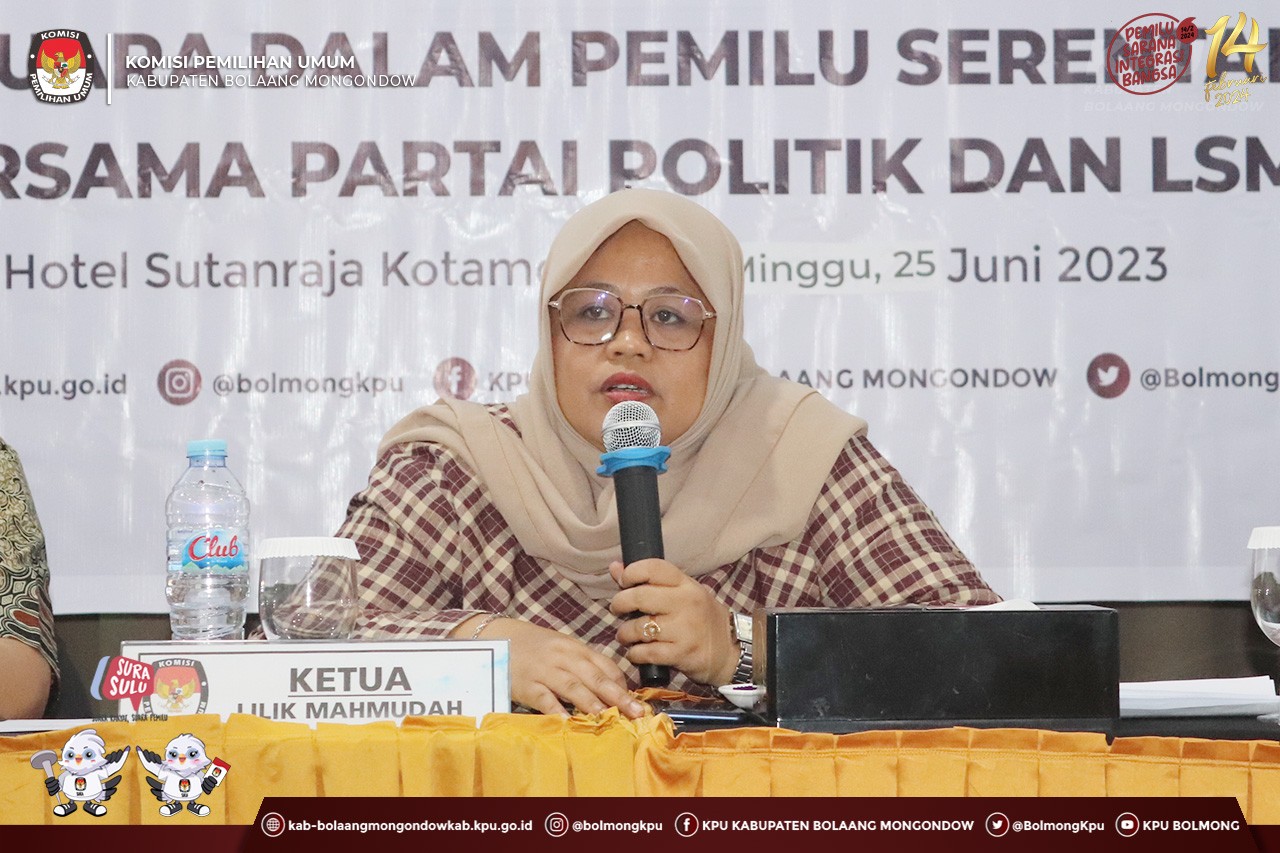 FGD yang dibuka oleh Ketua KPU Bolmong, Lilik Mahmudah ini dihadiri oleh hampir seluruh undangan yang terdiri dari perwakilan Parpol peserta Pemilu 2024 dan LSM pemerhati Pemilu. Dalam sambutannya, Lilik Mahmudah menyampaikan bahwa tahapan pemungutan dan perhitungan suara merupakan salah satu tahapan krusial dalam Pemilu ini, sehingganya KPU membuka kesempatan kepada Parpol dan LSM untuk bisa berkontribusi memberi masukan dan solusi terbaik terhadap perumusan kebijakannya.