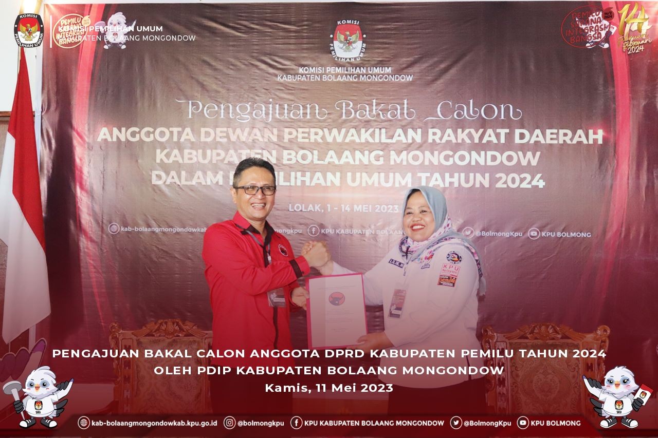 Lolak, kab-bolaangmongondow.kpu.go.id - Partai Demokrasi Indonesia Perjuangan (PDIP) Kabupaten Bolaang Mongondow mengajukan Bakal Calon Anggota DPRD Kabupaten Pemilu Tahun 2024, Kamis (11/5/2023) di Kantor KPU Kabupaten Bolaang Mongondow. Pengajuan dilakukan oleh Ketua DPC PDIP Kab. Bolmong, Yanny Ronny Tuuk, didampingi Sekretaris DPC, Ramono, Wakil Ketua DPC, Wolter Barakati, pukul 11.02 WITA.