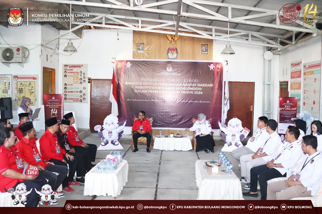 Delegasi partai diterima oleh Ketua KPU Kabupaten Bolaang Mongondow, Lilik Mahmudah, Anggota KPU Alfian B. Pobela, Hasrul Dumambow, Afif Zuhri, dan Ingga S. Adampe bersama Plt. Sekretaris Ratuganesty Mokoginta didampingi jajaran sekretariat.