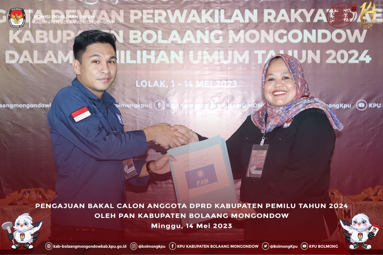 Lolak, kab-bolaangmongondow.kpu.go.id - Partai Amanat Nasional (PAN) Kabupaten Bolaang Mongondow mengajukan Bakal Calon Anggota DPRD Kabupaten Pemilu Tahun 2024, Minggu (14/5/2023) di Kantor KPU Kabupaten Bolaang Mongondow. Pengajuan dilakukan oleh Ketua DPD PAN Kab. Bolmong, Fazal Alzagladi, pukul 13.04 WITA.