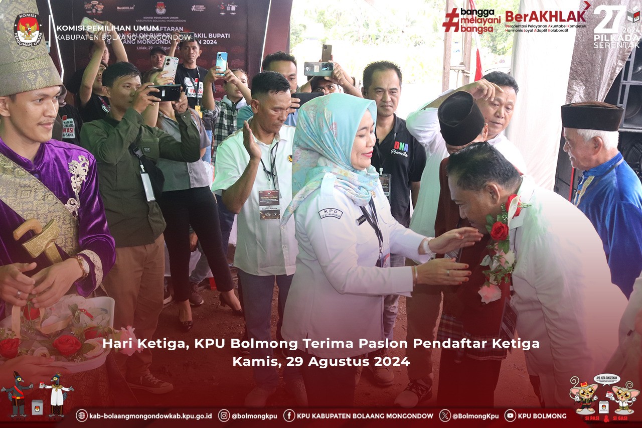 Bakal Paslon tersebut tiba di Kantor KPU Bolmong pada pukul 15.07 Wita dan langsung melakukan registrasi. Setelah itu diterima Ketua KPU Bolmong Afif Zuhri bersama Anggota Alfian B Pobela, Sandi Satria Dama, Jalaludin Koesasi dan Yohanes D Tumengkol. Kemudian Sekretaris KPU Bolmong, Ratuganesty Mokoginta memberikan pengalungan bunga sebagai bentuk ucapan selamat datang kepada Bakal Paslon pendaftar ketiga.