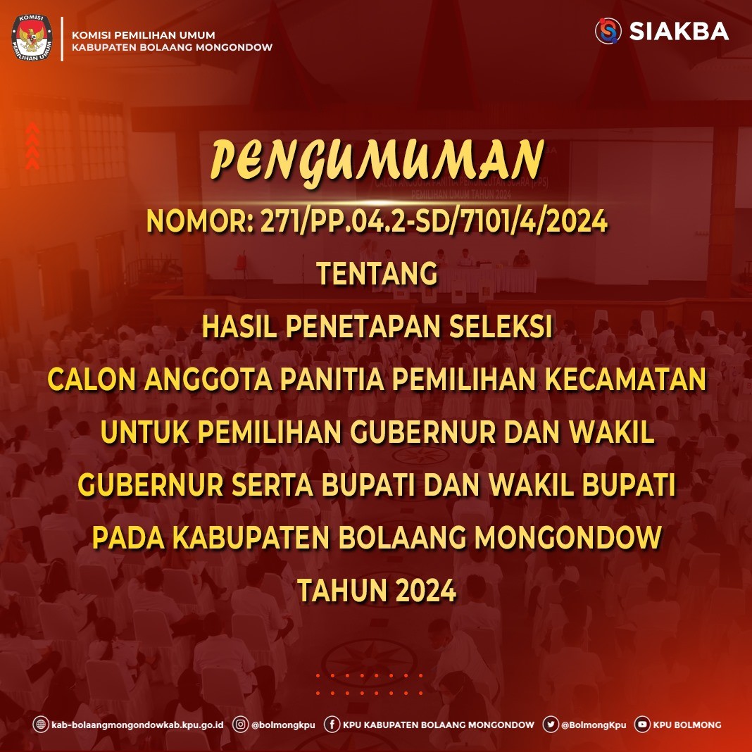 KPU Kabupaten Bolaang Mongondow telah mengumumkan Hasil Penetapan Seleksi Calon Anggota Panitia Pemilihan Kecamatan Untuk Pemilihan Gubernur Dan Wakil Gubernur Serta Bupati Dan Wakil Bupati Pada Kabupaten Bolaang Mongondow Tahun 2024.