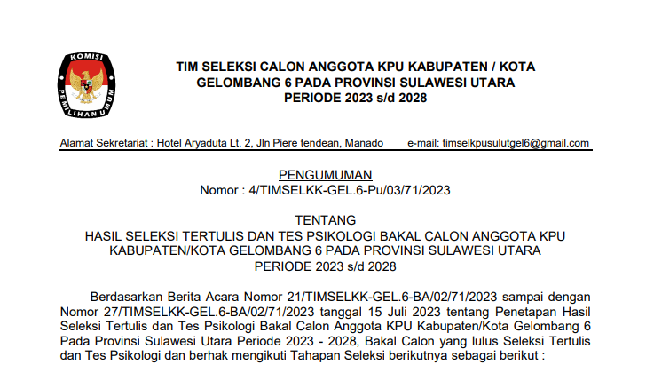 Berdasarkan Berita Acara Nomor 21/TIMSELKK-GEL.6-BA/02/71/2023 sampai dengan Nomor 27/TIMSELKK-GEL.6-BA/02/71/2023 tanggal 15 Juli 2023 tentang Penetapan Hasil Seleksi Tertulis dan Tes Psikologi Bakal Calon Anggota KPU Kabupaten/Kota Gelombang 6 Pada Provinsi Sulawesi Utara Periode 2023 - 2028, Bakal Calon yang lulus Seleksi Tertulis dan Tes Psikologi dan berhak mengikuti Tahapan Seleksi berikutnya sebagai berikut.