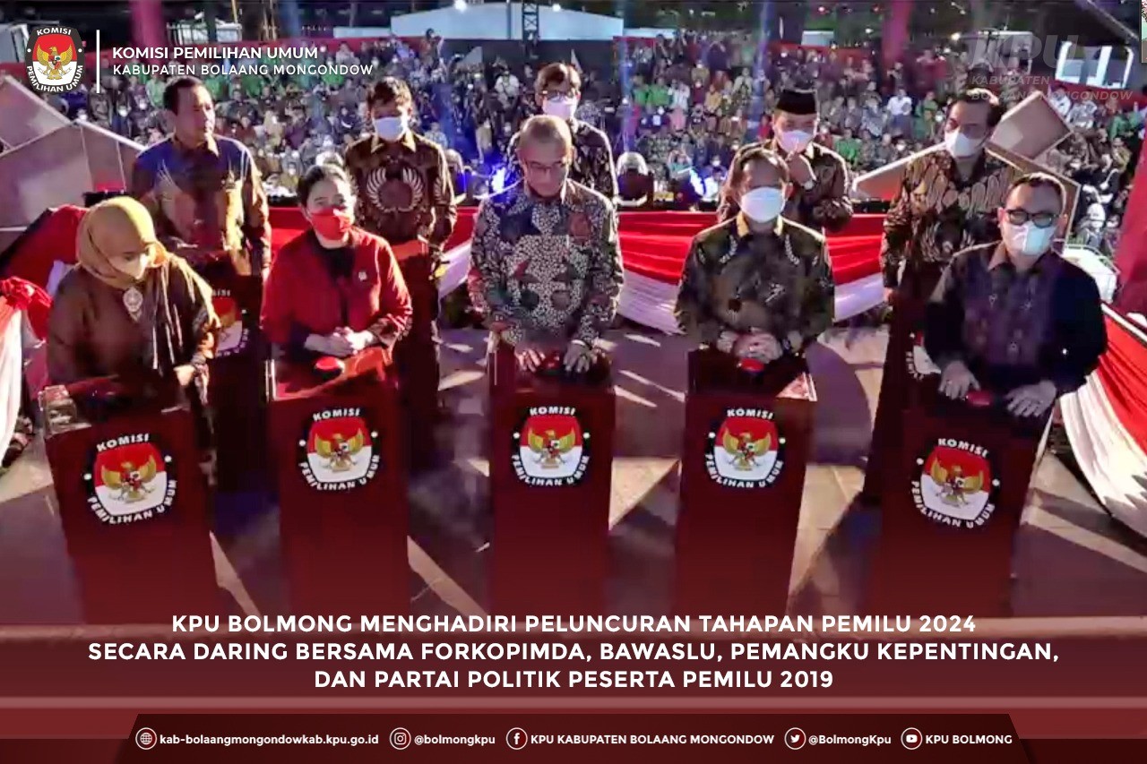 Lolak, kab-bolaangmongondow.kpu.go.id - Sebagaimana mandat konstitusi dan undang-undang bahwa tahapan penyelenggaraan Pemilu dilaksanakan 20 (dua puluh) bulan sebelum hari pemungutan suara, maka pada tanggal 14 Juni 2022 merupakan hari dimulainya tahapan Pemilu 2024. Hal ini ditandai dengan dilaksanakannya Kegiatan Peluncuran Tahapan Pemilu 2024 yang digelar KPU RI secara hybrid, Selasa (14/6).