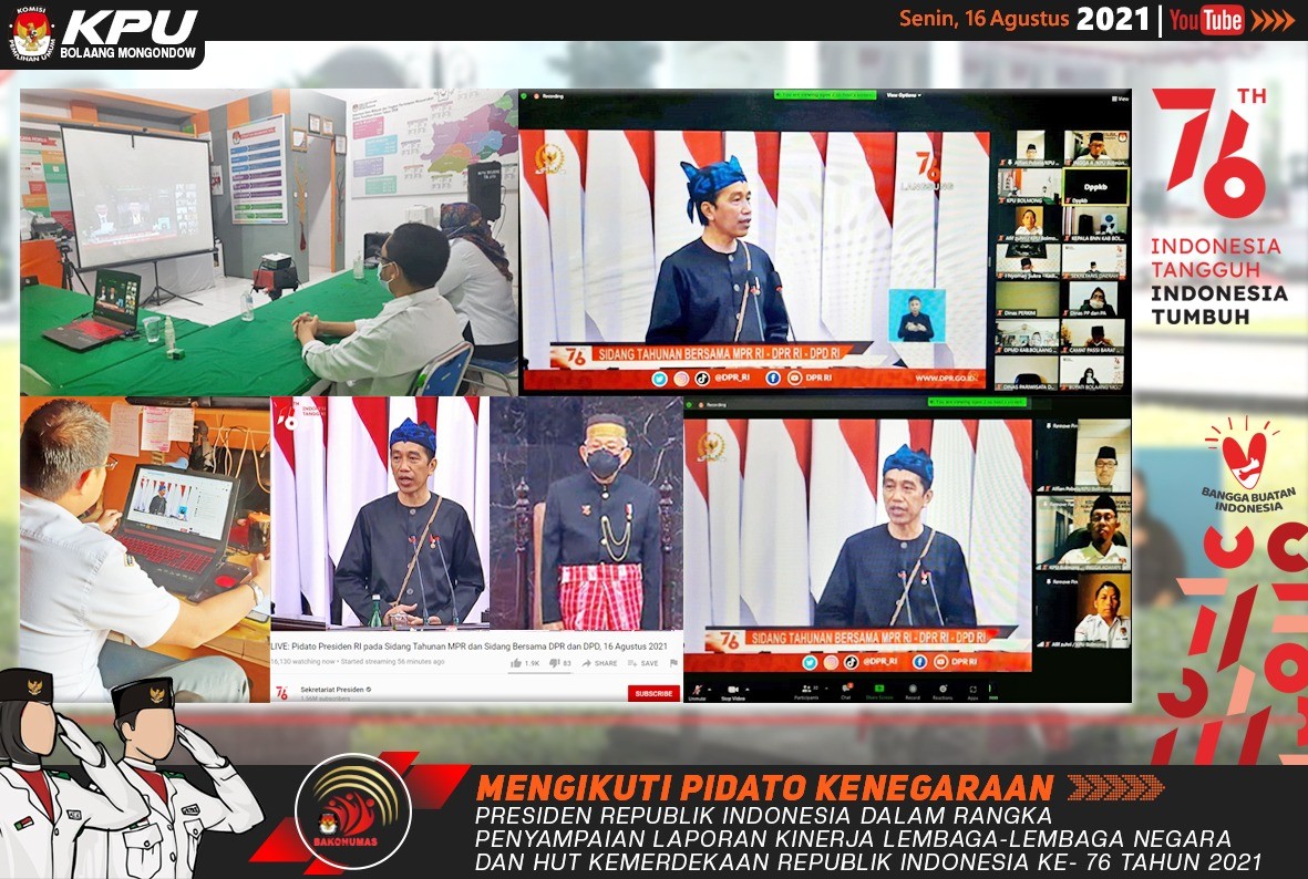 Lolak - Menindaklanjuti Surat Edaran Komisi Pemilihan Umum Republik Indonesia Nomor 15 Tahun 2021 tentang Peringatan Hari Ulang Tahun Kemerdekaan Republik Indonesia ke-76 Tahun 2021, maka KPU Kabupaten Bolaang Mongondow pada Senin (16/8) mengikuti siaran langsung Pidato Kenegaraan Presiden RI melalui berbagai kanal media.