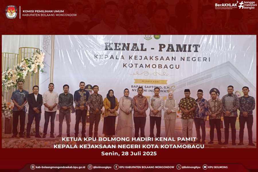 Lolak, kab-bolaangmongondow.kpu.go.id - Pada Senin (28/7/2025), Ketua KPU Kabupaten Bolaang Mongondow (Bolmong) Afif Zuhri menghadiri Kenal Pamit Kepala Kejaksaan Negeri Kotamobagu. Dalam kesempatan ini dilaksanakan Prosesi Serah Terima Jabatan dari Kepala Kejaksaan yang lama Bapak Elwin A. Khahar, S.h.,M.H kepada Kepala Kejakasaan yang baru Bapak Saptono, S.H.