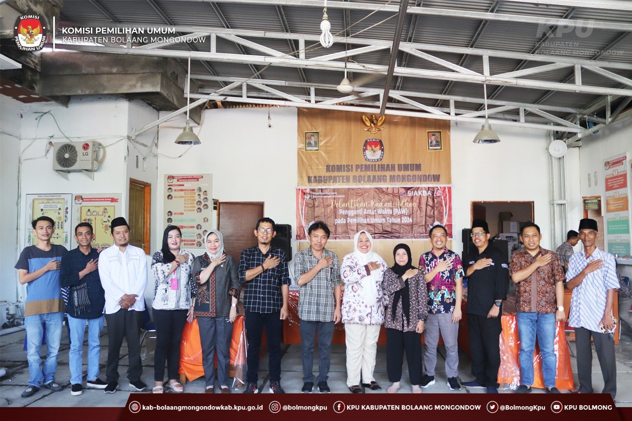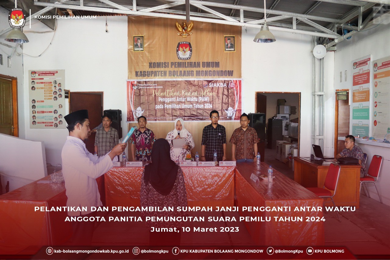 Lolak, kab-bolaangmongondow.kpu.go.id - Ketua KPU Kabupaten Bolaang Mongondow, Lilik Mahmudah resmi mengambil sumpah dan melantik Pengganti Antar Waktu (PAW) anggota Panitia Pemungutan Suara (PPS) Pemilu Tahun 2024, Rabu (10/3). Anggota PPS yang dilantik tersebut berasal dari Desa Wangga Baru, Kecamatan Dumoga Barat atas nama Suhartin M. Patamani.