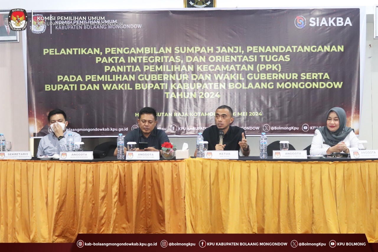 Setelah dilantik, seluruh PPK kemudian dibekali dengan orientasi tugas yang disampaikan oleh masing-masing komisioner KPU Bolmong, Afif Zuhri, Alfian B. Pobela, Sandi Satria Dama dan Yohanes D. Tumengkol. Turut hadir juga menyampaikan arahan, Anggota KPU Provinsi Sulawesi Utara Divisi Sosialisasi, Pendidikan Pemilih, Parmas dan SDM, Awaluddin Umbola.