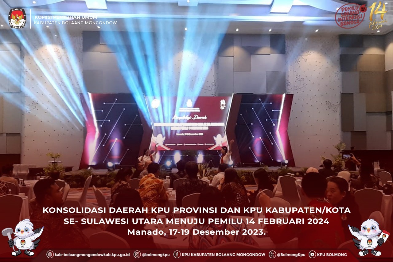Lolak, kab-bolaangmongondow.kpu.go.id - Komisi Pemilihan Umum Kabupaten Bolaang Mongondow (KPU Bolmong) mengikuti Rapat Konsolidasi Daerah (Rakorda) 2023 yang digelar KPU Provinsi Sulawesi Utara di hotel Fourpoint Manado, tanggal 17-19 Desember 2023.