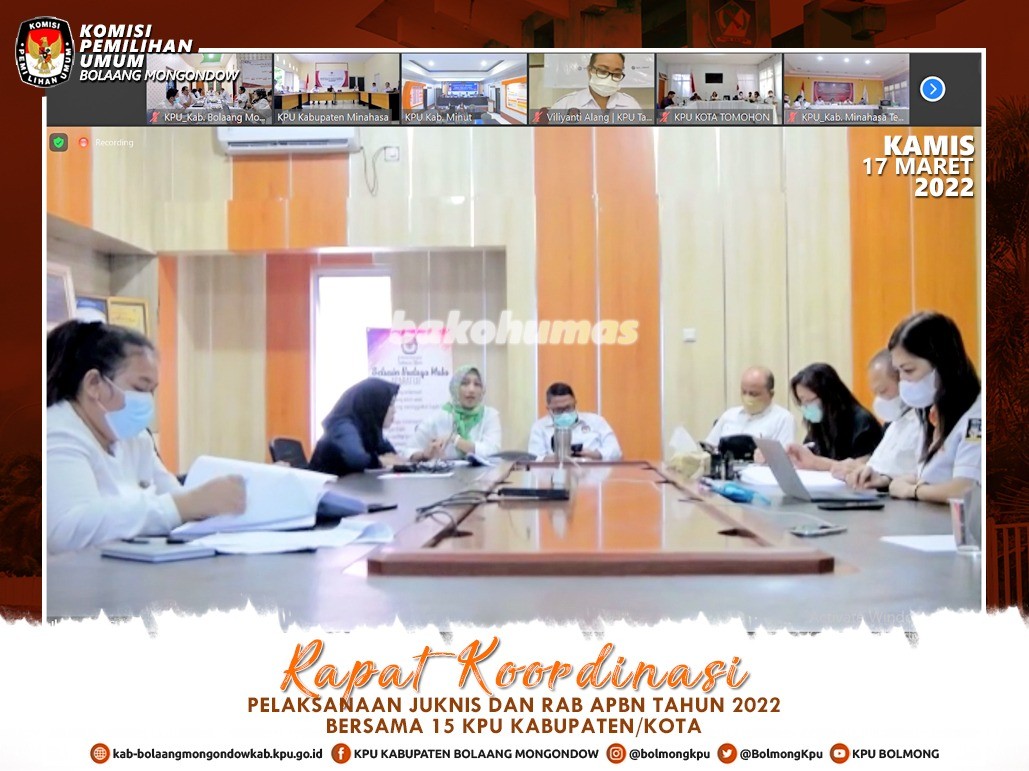 Lolak, kab-bolaangmongondow.kpu.go.id - KPU Kabupaten Bolaang Mongondow pada Kamis, 17 Maret 2022 mengikuti Rapat Koordinasi Pelaksanaan Juknis dan RAB APBN 2022 yg dilaksanakan secara daring oleh KPU Provinsi Sulawesi Utara. Kegiatan ini dihadiri oleh Ketua dan Anggota KPU, Sekretaris serta para Kepala Sub Bagian KPU se-Sulawesi Utara.