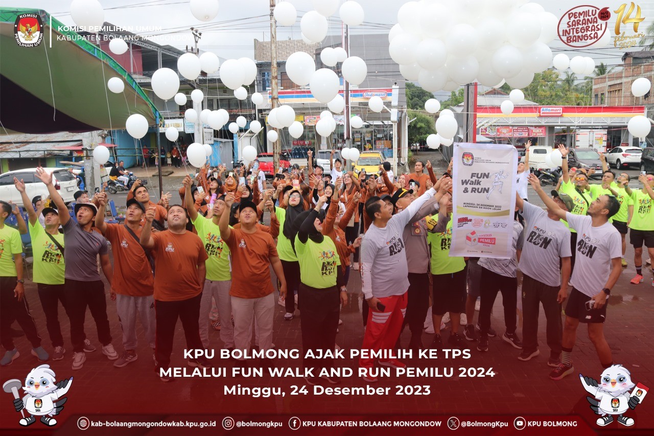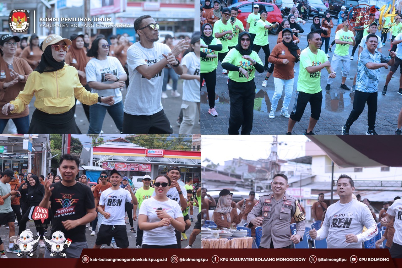 Lolak, kab-bolaangmongondow.kpu.go.id - Komisi Pemilihan Umum (KPU) Kabupaten Bolaang Mongondow menggelar Fun Walk and Run Pemilu 2024 sebagai salah satu upaya mengajak pemilih menyalurkan hak pilihnya di Tempat Pemungutan Suara (TPS) pada 14 Februari 2024.
