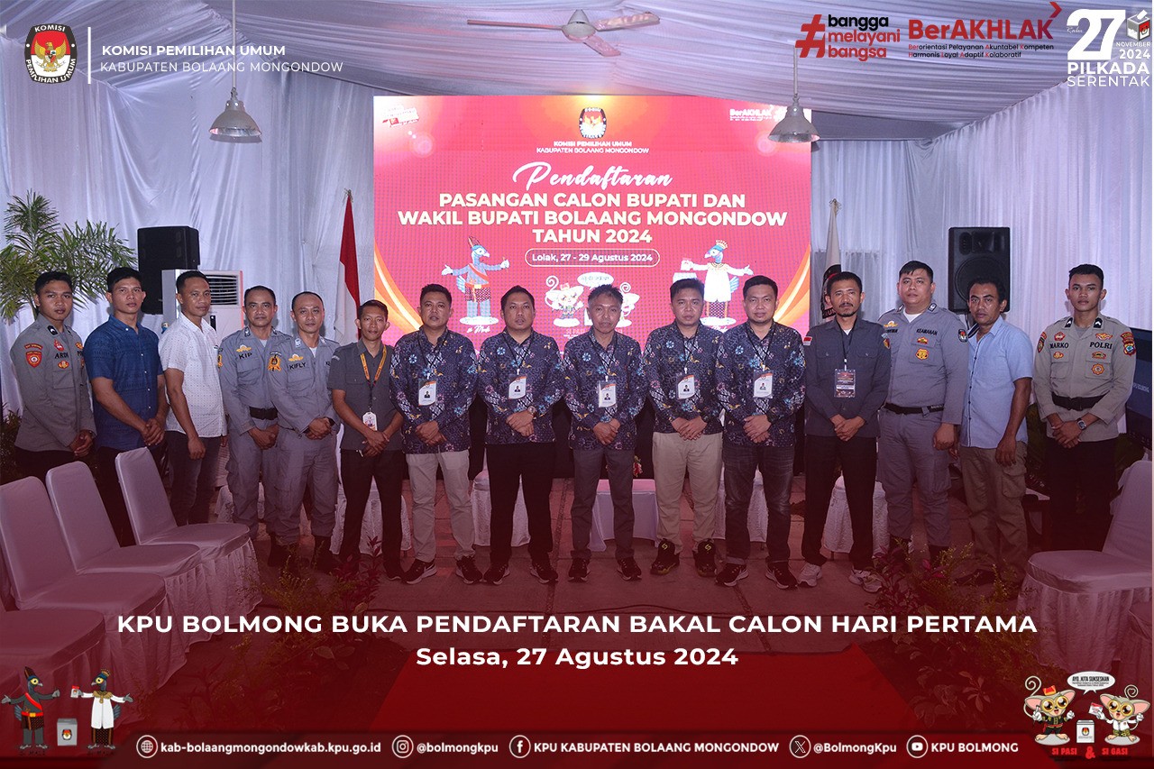 Lolak, kab-bolaangmongondow.kpu.go.id - KPU Kabupaten Bolaang Mongondow (KPU Bolmong) resmi membuka pendaftaran Pasangan Calon Bupati dan Wakil Bupati Bolaang Mongondow mulai tanggal 27 -29 Agustus 2024 di Kantor KPU Bolmong.