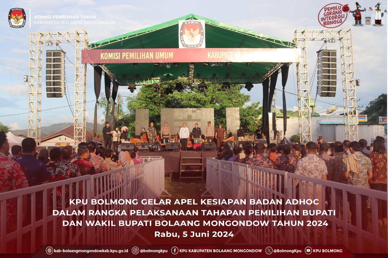 KPU BOLMONG GELAR APEL KESIAPAN BADAN ADHOC DALAM RANGKA PELAKSANAAN TAHAPAN PEMILIHAN BUPATI DAN WAKIL BUPATI BOLAANG MONGONDOW TAHUN 2024