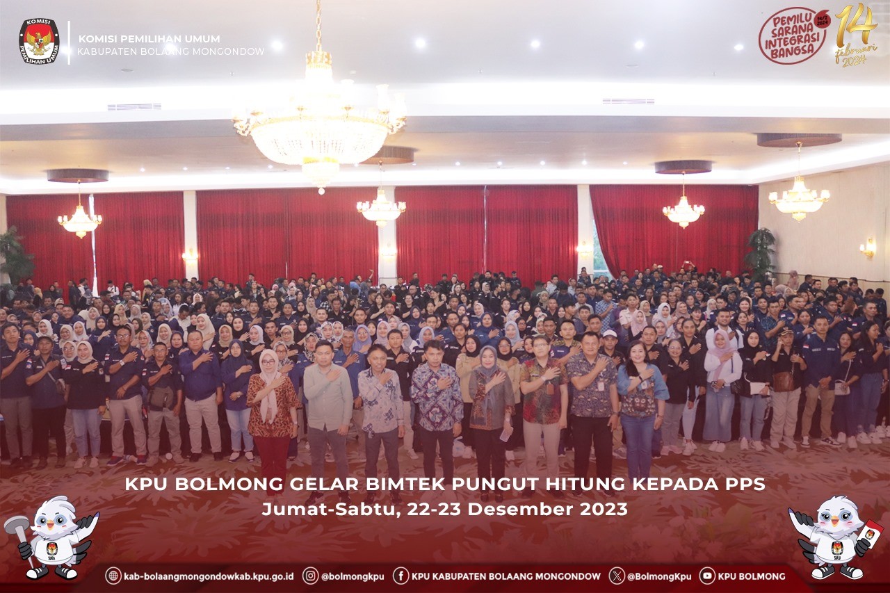 Lolak, kab-bolaangmongondow.kpu.go.id - Komisi Pemilihan Umum (KPU) Kabupaten Bolaang Mongondow (Bolmong) menggelar Bimbingan Teknis Pemungutan, Penghitungan, dan Rekapitulasi Hasil Perolehan Suara dan Penggunaan Aplikasi Sirekap dalam Pemilu Tahun 2024 kepada 606 Panitia Pemungutan Suara (PPS) se- Bolmong, (22-23 Desember 2023). Bimtek ini juga turut menghadirkan Panitia Pemilihan Kecamatan (PPK) yang sebelumnya telah menerima bimtek oleh KPU Provinsi Sulawesi Utara (Sulut).