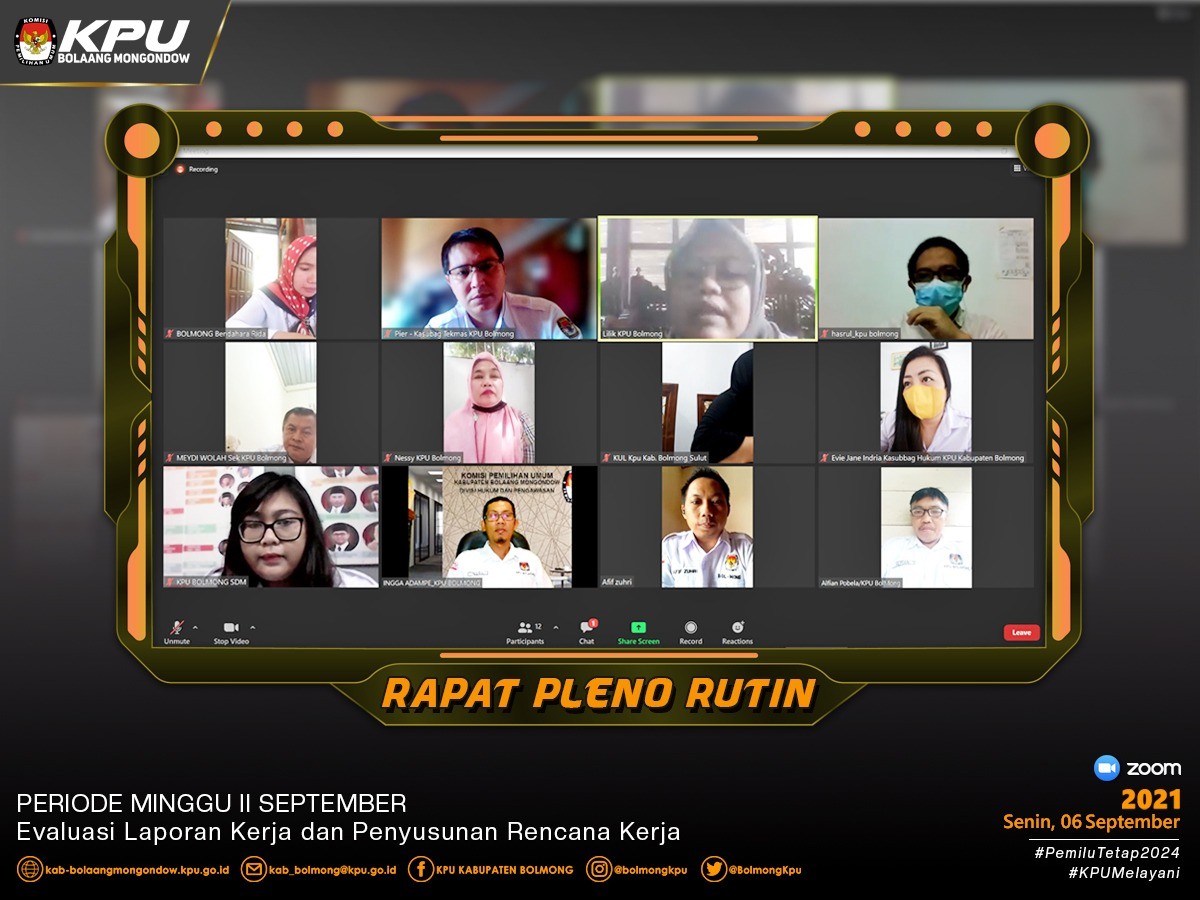 Lolak - KPU Kabupaten Bolaang Mongondow kembali menggelar Rapat Pleno Rutin (RPR) pada Senin, 6 September 2021. Rapat ini dilaksanakan secara luring dan daring sebagaimana surat undangan Ketua KPU Kabupaten Bolaang Mongondow Nomor : 171/TU.01.1-Und/7101/KPU-Kab/IX/2021.