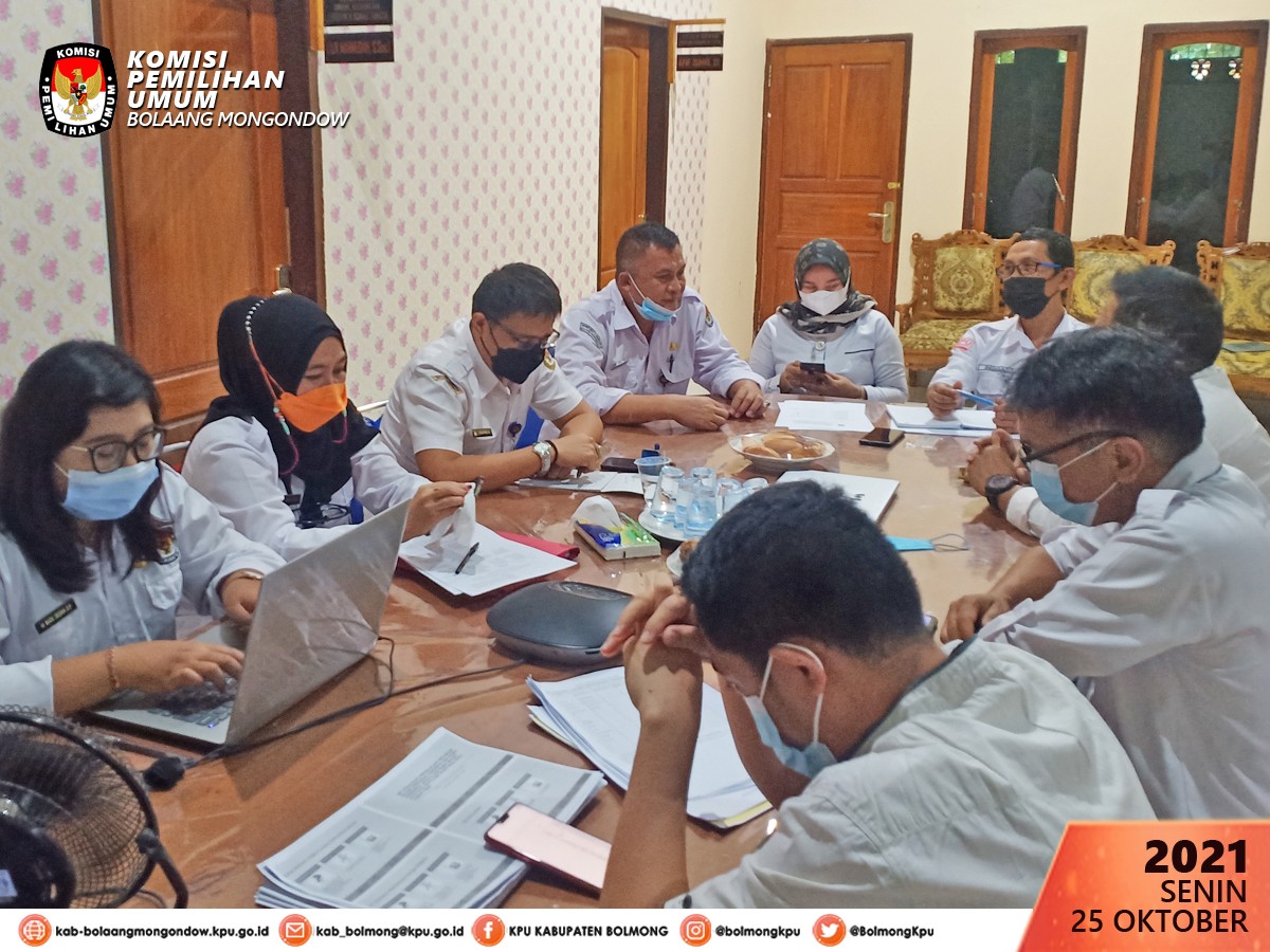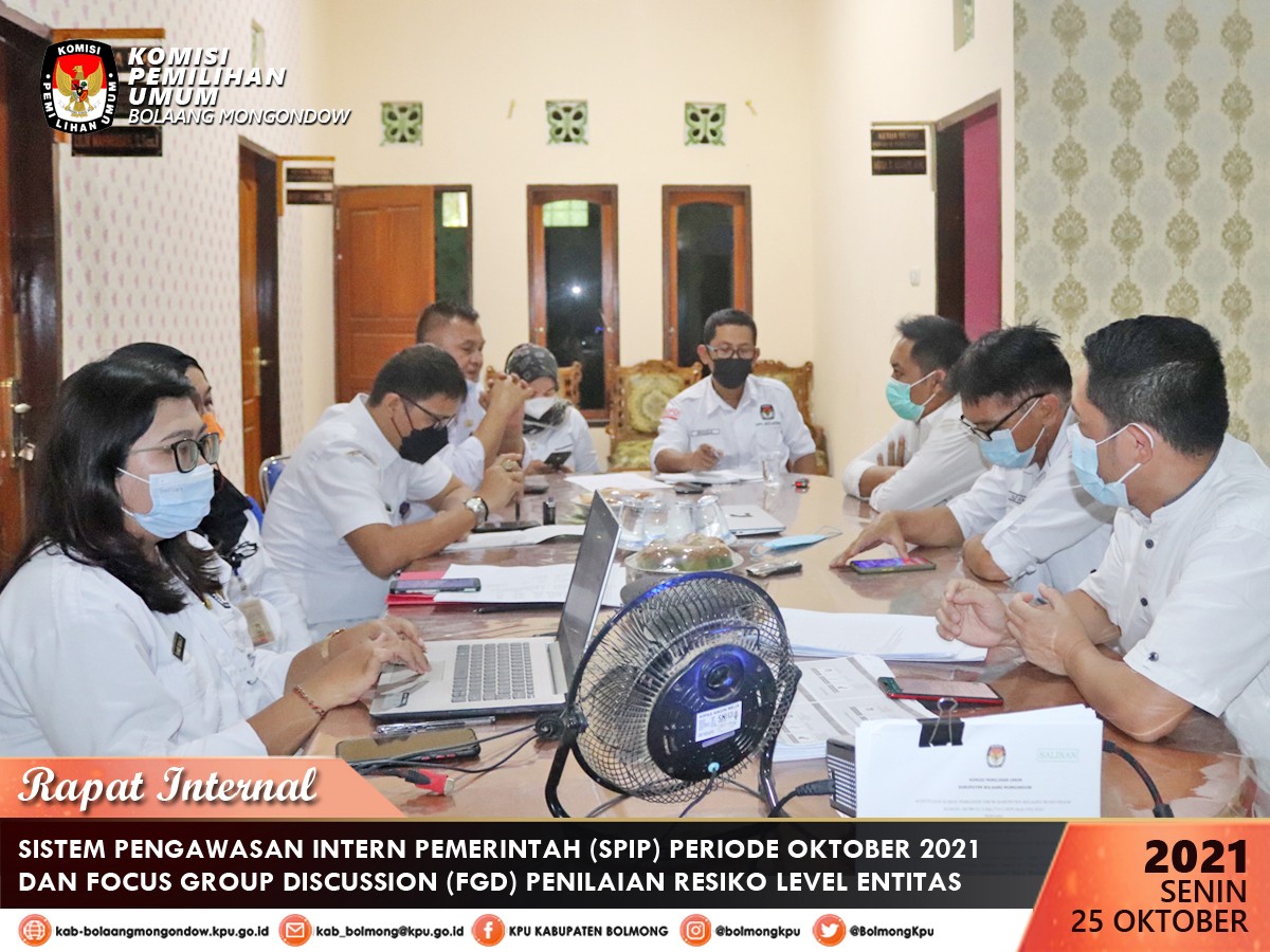 Lolak - Sesuai dengan surat undangan Plh. Ketua KPU Kabupaten Bolaang Mongondow Nomor : 204/PW.01/7101/2021 tanggal 22 Oktober 2021 guna Pelaporan Implementasi Sistem Pengendalian Intern Pemerintah (SPIP) serta untuk kewajiban penyusunan dan pelaporan Kartu Kendali sebagaimana dalam Surat Edaran Komisi Pemilihan Umum Republik Indonesia Nomor: 1406/PW.01-SD/08/SJ/X/2017 tanggal 20 Oktober 2017 perihal Penyelenggaraan Sistem Pengendalian Intern Pemerintah (SPIP) Pengisian dan Pelaporan Kartu Kendali untuk KPU Provinsi/KIP Aceh dan KPU/KIP Kabupaten/Kota, Komisi Pemilihan Umum Kabupaten Bolaang Mongondow telah melaksanakan Rapat Penyelenggaraan Sistem Pengendalian Intern Pemerintah (SPIP) bulan Oktober 2021 pada hari Senin (25/10), kegiatan ini dilanjutkan dengan Focus Grup Disscusion (FGD) Penilaian Risiko Level Entitas di lingkungan KPU Kabupaten Bolaang Mongondow sebagai bentuk tindak lanjut dari Lokakarya Penilaian Resiko (Workshop Risk Assessment) yang dilaksanakan oleh KPU Provinsi Sulawesi Utara pada hari Kamis, 14 Oktober 2021.