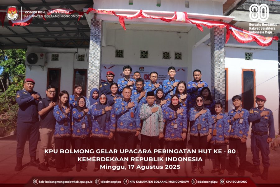 Lolak, kab-bolaangmongondow.kpu.go.id, puncak peringatan HUT Ke - 80 RI, KPU Kabupaten Bolaang Mongondow (Bolmong) menggelar Upacara Pengibaran Merah Putih di halaman kantor KPU Bolmong. Upacara berlangsung khidmat dengan dihadiri oleh Komisioner dan jajaran Sekretariat.
