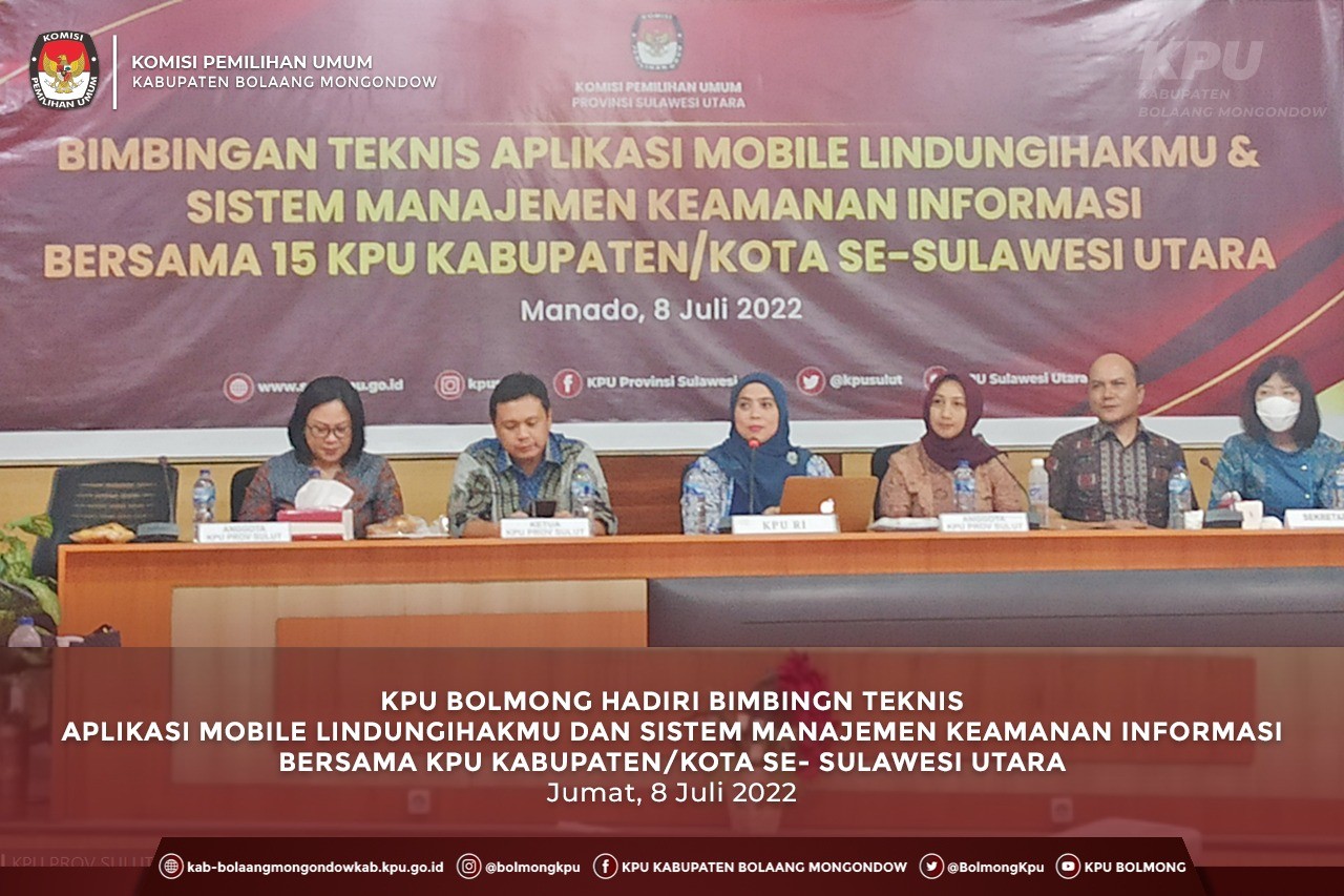 Lolak, kab-bolaangmongondow.kpu.go.id - Pada Jumat, 8 Juli 2022, KPU Kabupaten Bolaang Mongondow mengikuti Bimbingan Teknis Penggunaan Aplikasi Mobile Lindungihakmu dan Sistem Manajemen Keamanan Informasi yang diselenggarakan oleh KPU Provinsi Sulawesi Utara. Kegiatan ini dilaksanakan secara luring dan daring, secara luring dihadiri oleh Ketua Divisi Perencanaan,Data dan Informasi, Kasubbag Perencanaan, Data dan Informasi dan Operator Sidalih se-Sulawesi Utara, sedangkan secara daring diikuti oleh Ketua, Ketua Divisi Teknis Penyelenggaraan, Ketua Divisi Hukum dan Pengawasan, Ketua Divisi Sosialisasi, Pendidikan Pemilih, Partisipasi Masyarakat dan SDM serta Sekretaris KPU Kabupaten/Kota Se-Sulawesi Utara.