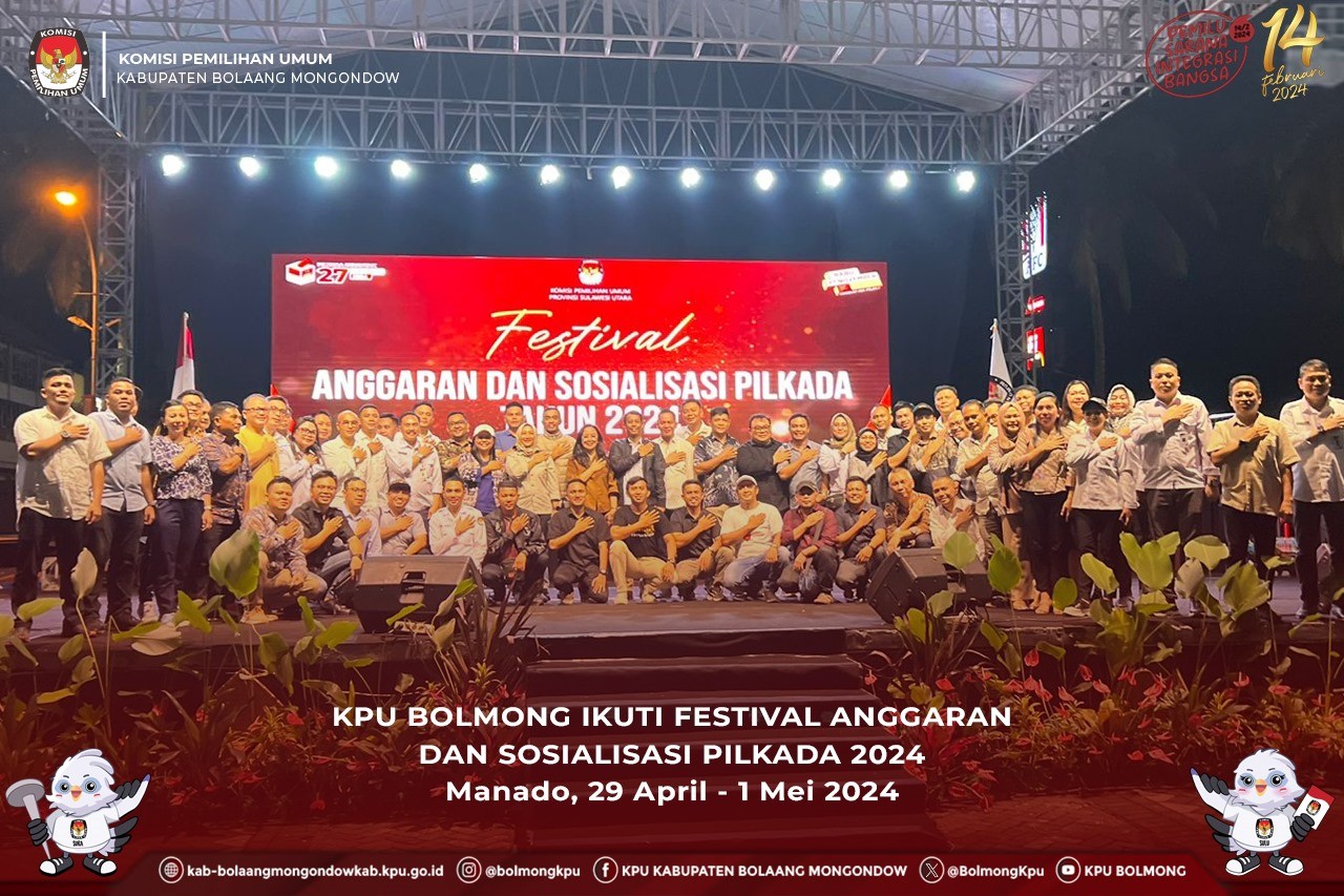 Lolak, kab-bolaangmongondow.kpu.go.id - KPU Kabupaten Bolaang Mongondow (Bolmong) mengikuti kegiatan Festival Anggaran dan Sosialisasi Pilkada Tahun 2024 yang digelar KPU Provinsi Sulawesi Utara. Kegiatan ini merupakan rangkaian Peluncuran Tahapan Pemilihan Gubernur dan Wakil Gubernur Sulawesi Utara Tahun 2024 yang puncaknya akan dilaksanakan pada Rabu, 1 Mei 2024 di Lapangan Basket, Kawasan Megamas Manado.