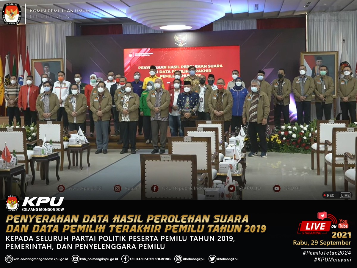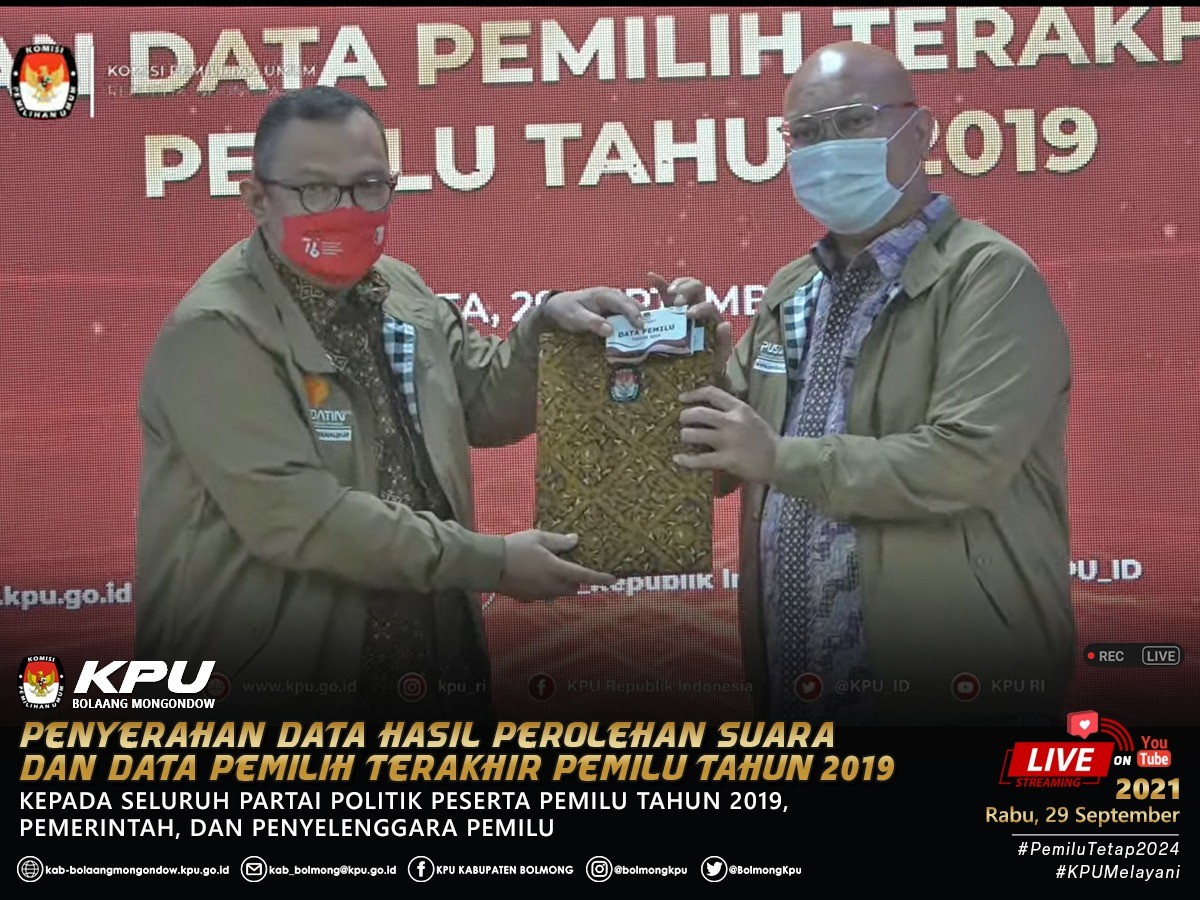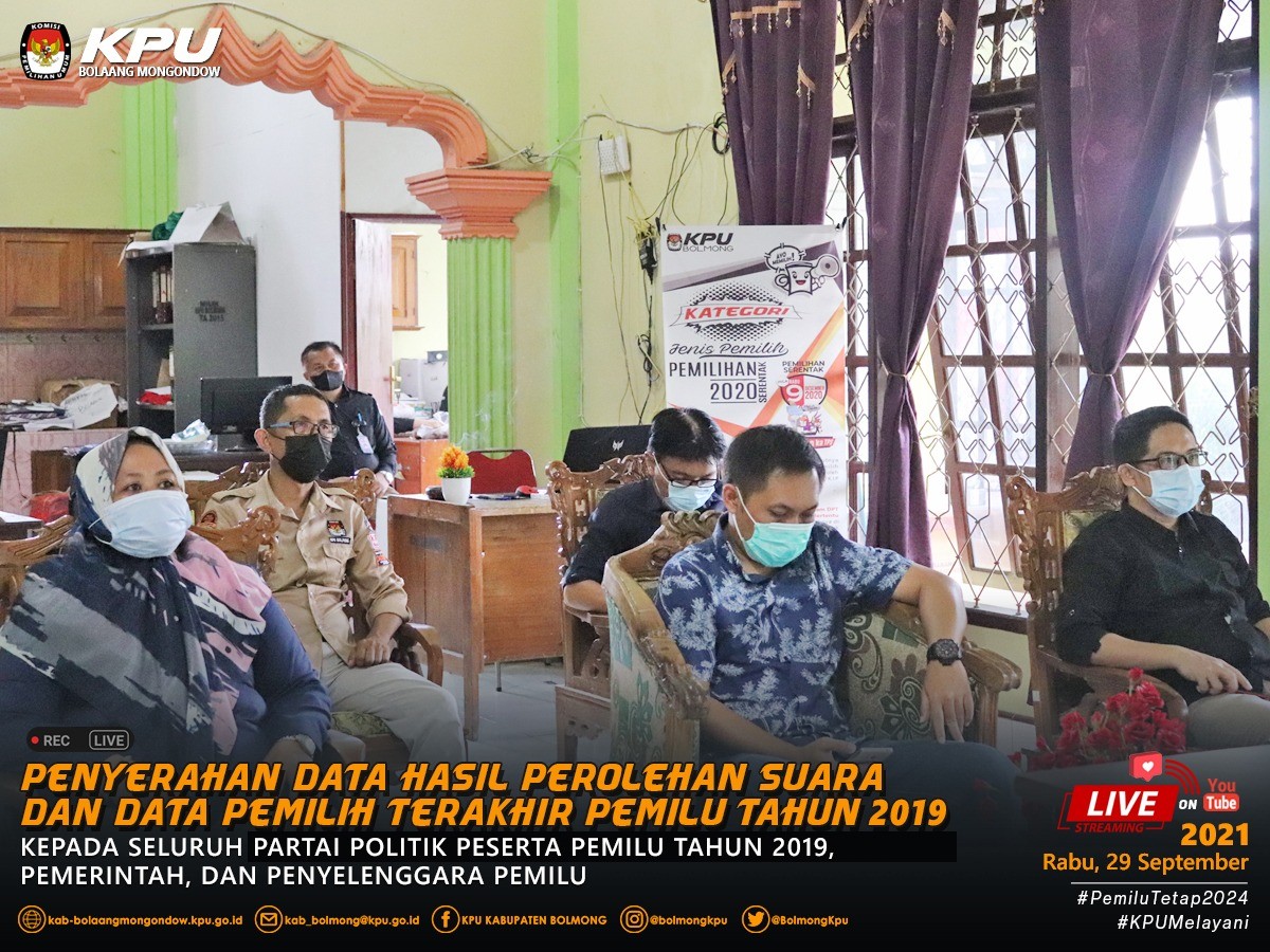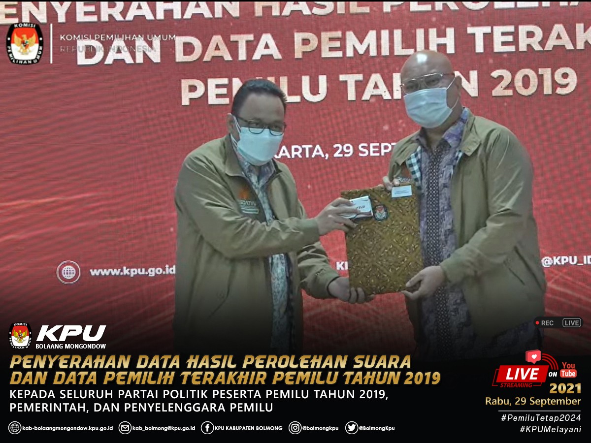 Lolak - Pada Rabu (29/9/2021) Komisi Pemilihan Umum (KPU) Kabupaten Bolaang Mongondow (Bolmong) hadir mengikuti kegiatan yang diselenggarakan oleh KPU RI, yaitu Penyerahan Data Hasil Perolehan Suara dan Data Pemilih Terakhir Pemilu 2019 kepada seluruh Partai Politik Peserta Pemilu 2019, Pemerintah, dan Penyelenggara Pemilu, baik Badan Pengawas Pemilihan Umum (Bawaslu) RI maupun Dewan Kehormatan Penyelenggara Pemilu (DKPP) RI.