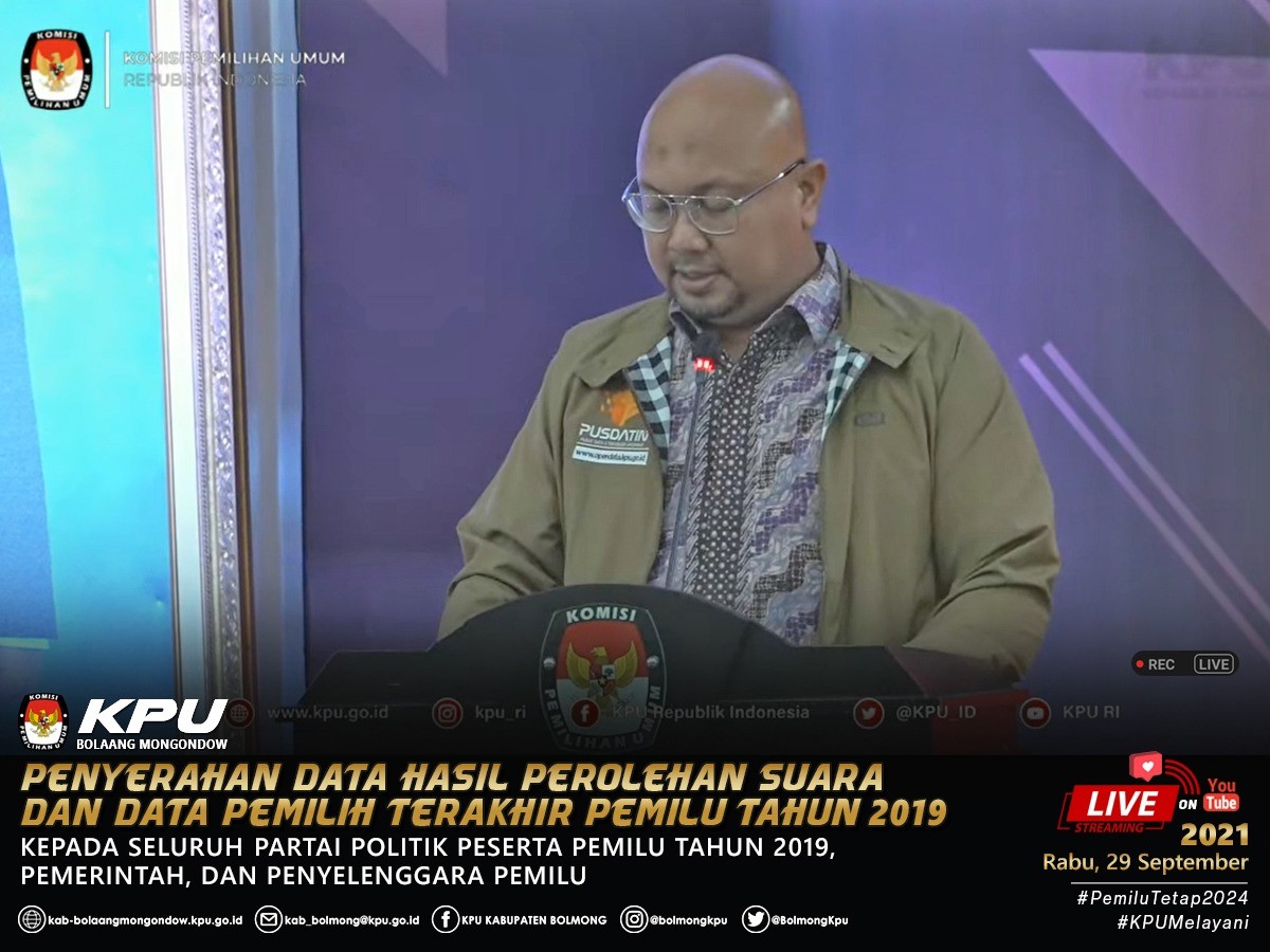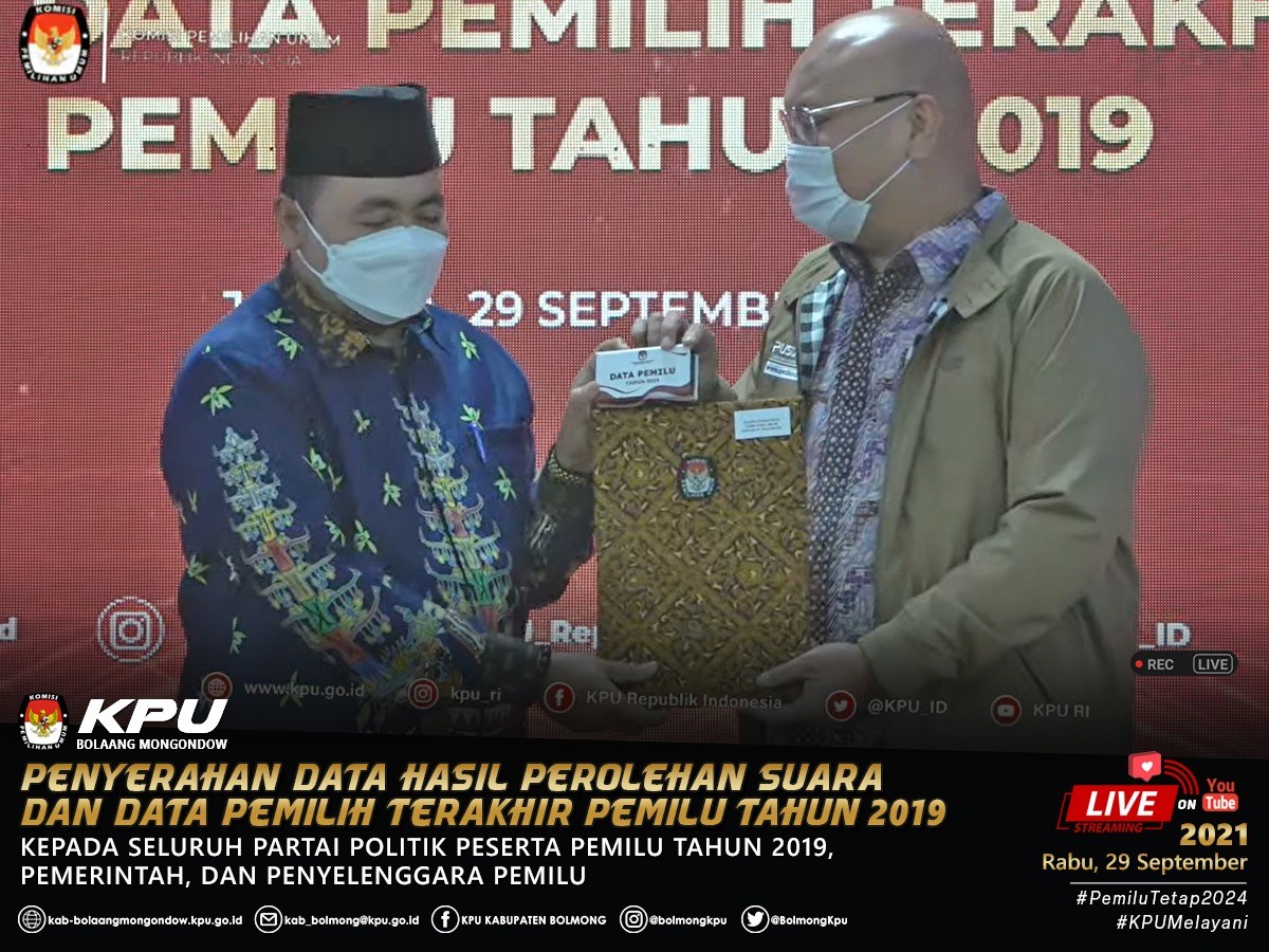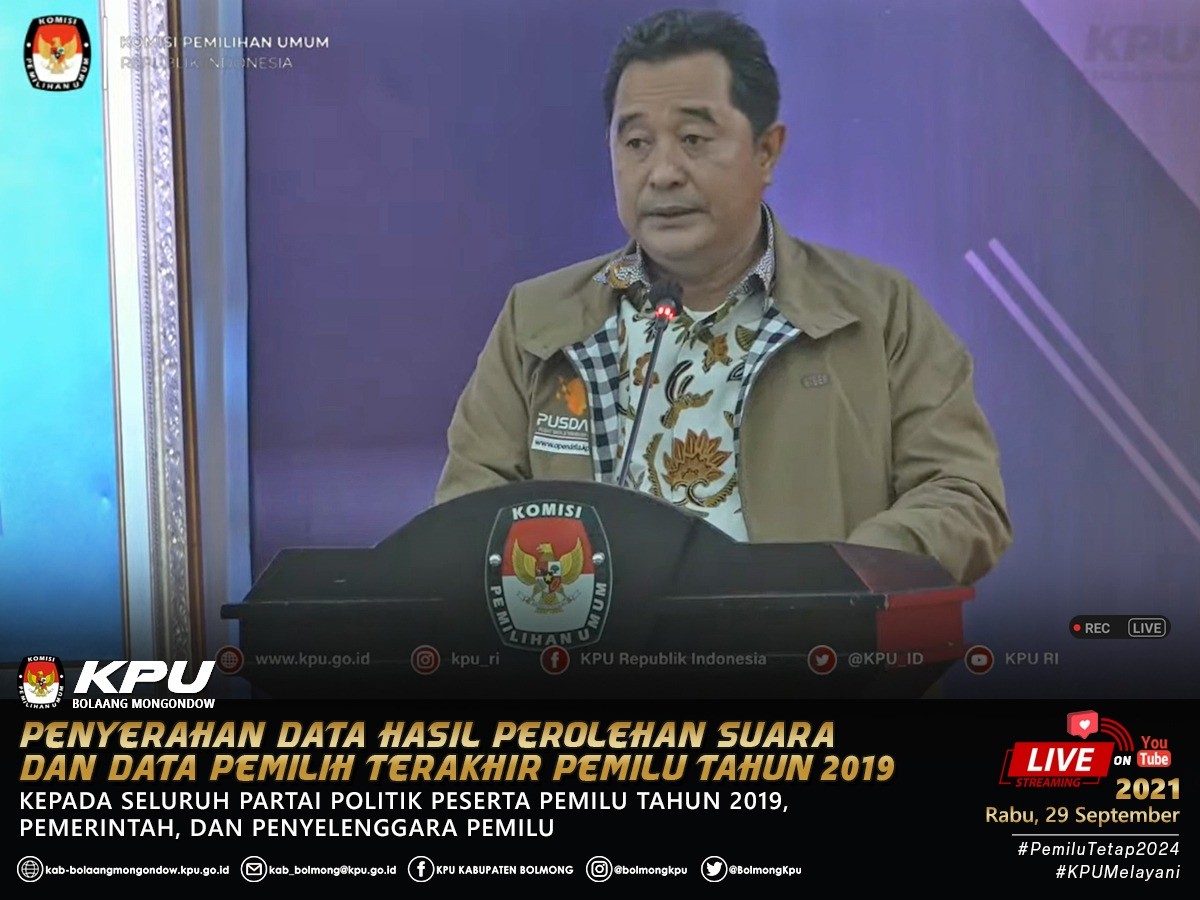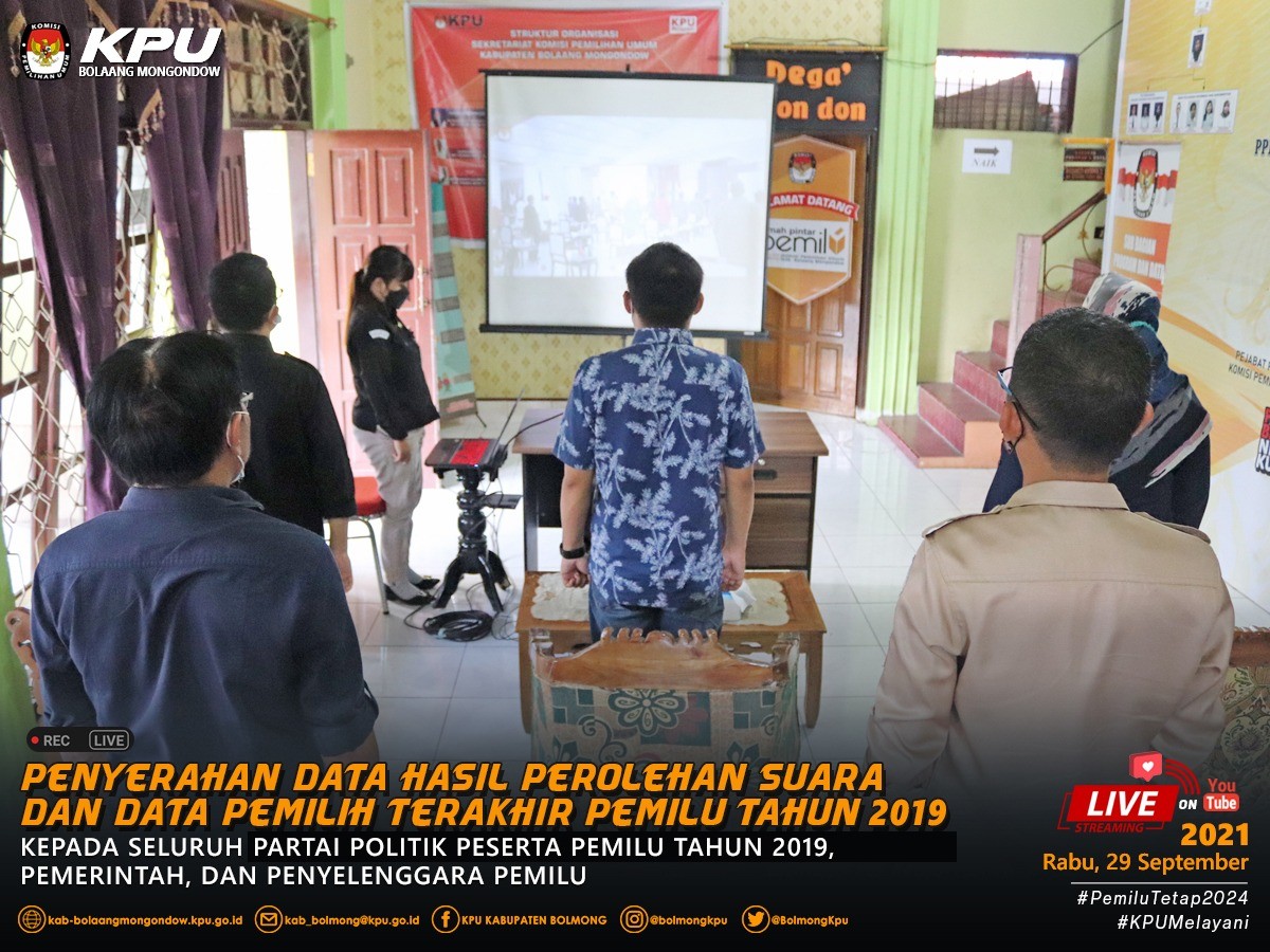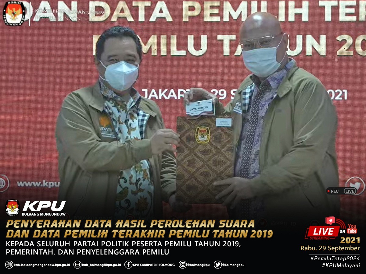 Lolak - Pada Rabu (29/9/2021) Komisi Pemilihan Umum (KPU) Kabupaten Bolaang Mongondow (Bolmong) hadir mengikuti kegiatan yang diselenggarakan oleh KPU RI, yaitu Penyerahan Data Hasil Perolehan Suara dan Data Pemilih Terakhir Pemilu 2019 kepada seluruh Partai Politik Peserta Pemilu 2019, Pemerintah, dan Penyelenggara Pemilu, baik Badan Pengawas Pemilihan Umum (Bawaslu) RI maupun Dewan Kehormatan Penyelenggara Pemilu (DKPP) RI.