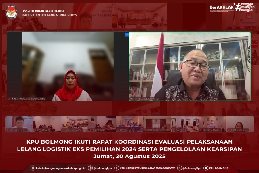 Lolak, kab-bolaangmongondow.kpu.go.id - Sebagai tindak lanjut Surat Dinas Sekretaris Jenderal KPU RI No. 1343/RT.01.3-SD/05/2025 tanggal 21 April 2025 mengenai pemindahtanganan Barang Milik Negara (BMN) berupa persediaan Pemilihan Tahun 2024, KPU Kabupaten Bolaang Mongondow (Bolmong) mengikuti Rapat Koordinasi Evaluasi Pelaksanaan Lelang Logistik Eks Pemilihan 2024 Serta Pengelolaan Kearsipan yang digelar KPU Provinsi Sulawesi Utara (Sulut), Jumat (22/08).