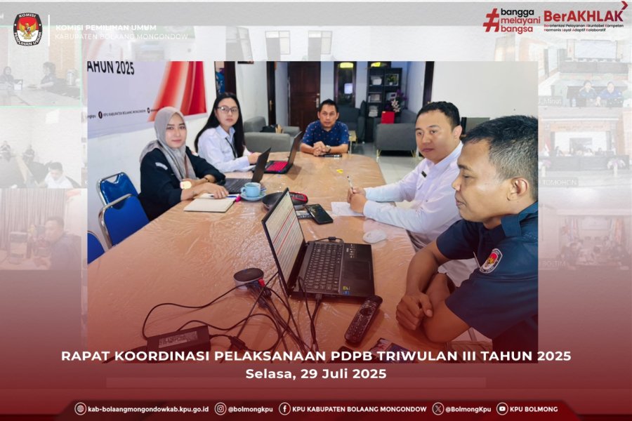 Lolak, kab-bolaangmongondow.kpu.go.id, KPU Kabupaten Bolaang Mongondow (Bolmong) mengikuti Rapat koordinasi secara daring terkait pelaksanaan PDPB Triwulan III yang digelar oleh KPU Provinsi Sulawesi Utara (Sulut) pada Selasa, 29 Juli 2025.