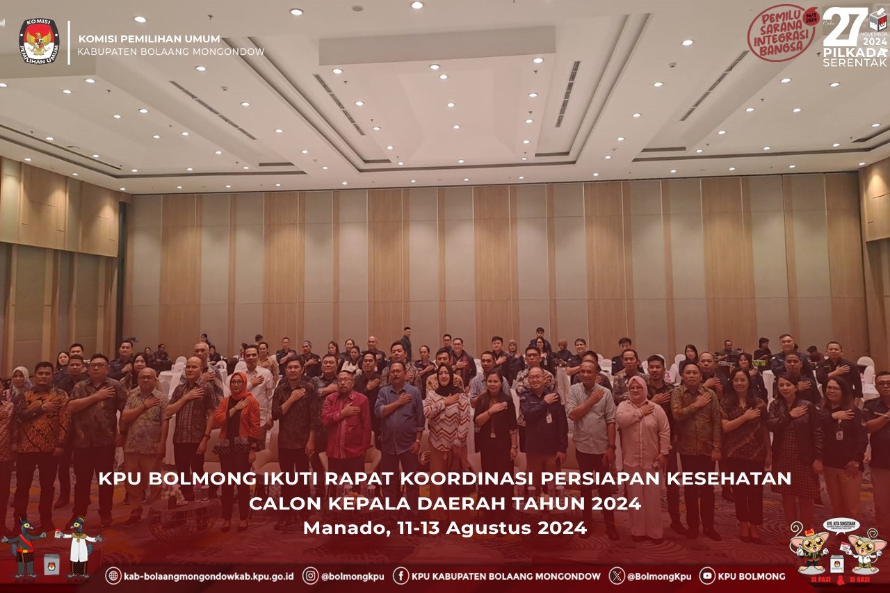 Lolak, kab-bolaangmongondow.kpu.go.id - Dalam rangka mematangkan persiapan tahapan pemeriksaan kesehatan calon kepala daerah, KPU Kabupaten Bolaang Mongondow mengikuti kegiatan Rapat Koordinasi Persiapan Pemeriksaan Kesehatan Calon Kepala Daerah dalam rangka Pemilihan Serentak Nasional Tahun 2024 yang digelar KPU Provinsi Sulawesi Utara (Sulut), 11-13 Agustus 2024.