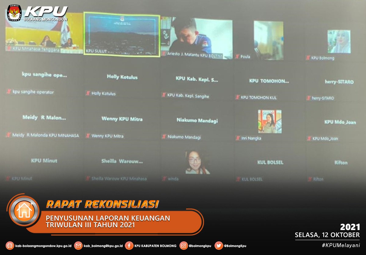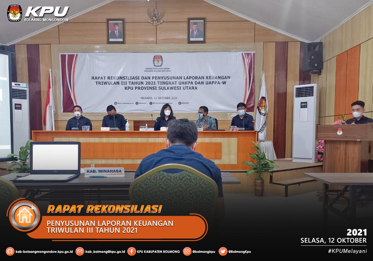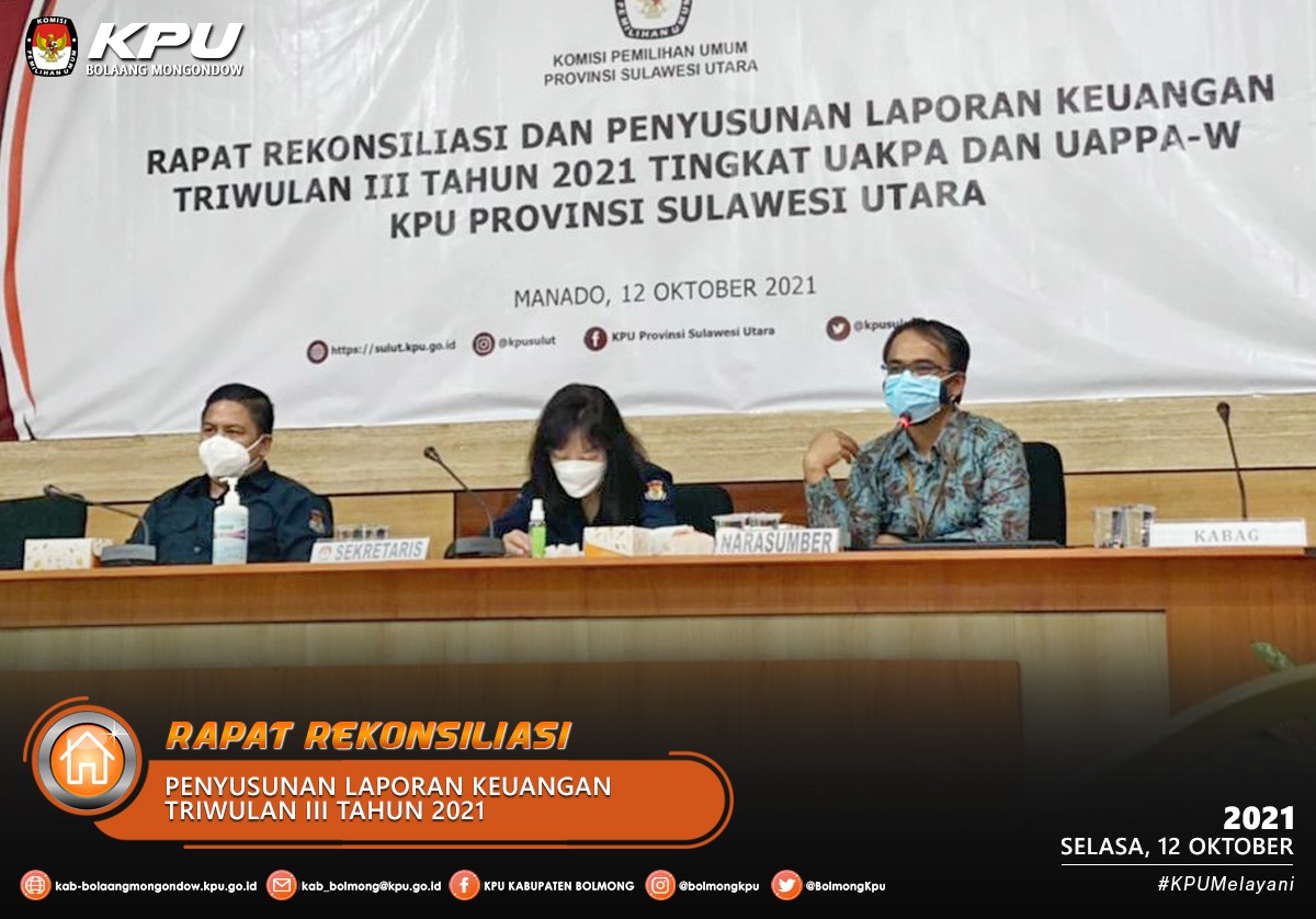 Lolak - KPU Kabupaten Bolaang Mongondow menghadiri Rapat Rekonsiliasi dan Penyusunan Laporan Keuangan Triwulan III Tahun 2021 Tingkat UAKPA dan UAPPA-W Tingkat Wilayah yang diselenggarakan oleh KPU Provinsi Sulawesi Utara pada Selasa (12/10) bertempat di Aula KPU Provinsi Sulawesi Utara mulai pukul 11.00 Wita secara daring dan luring. Penyusunan LKKL Triwulan III Tahun 2021 berpedoman pada PMK Nomor 222/PMK.06.2016 tentang Perubahan atas PMK Nomor 177/PMK.05/X/015 tentang Pedoman Penyusunan dan Penyampaian LKKL.