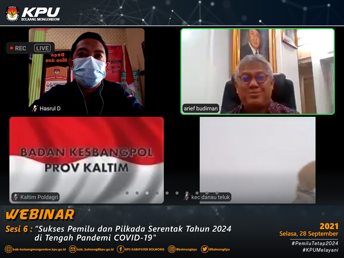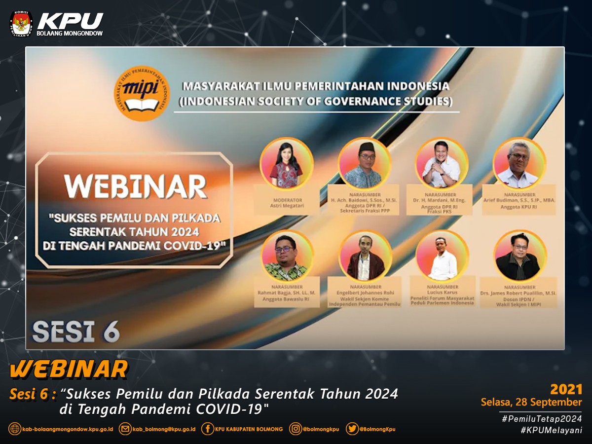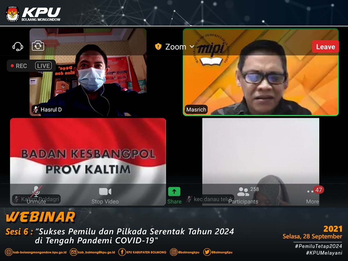 Lolak - Ketua KPU Kabupaten Bolaang Mongondow, Lilik Mahmudah, Sos.I dan Anggota KPU Divisi Sosialisasi, Pendidikan Pemilih, Partisipasi Masyarakat dan SDM, Hasrul Dumambow, S.E memenuhi undangan Pemerintah Daerah Kabupaten Bolaang Mongondow untuk mengikuti Webinar bertajuk Sukses Pemilu dan Pilkada Serentak Tahun 2024 di Tengah Pandemi Covid-19 sesi 6 yang diselenggarakan oleh Masyarakat Ilmu Pemerintahan Indonesia (MIPI) secara daring pada, Selasa (28/9).