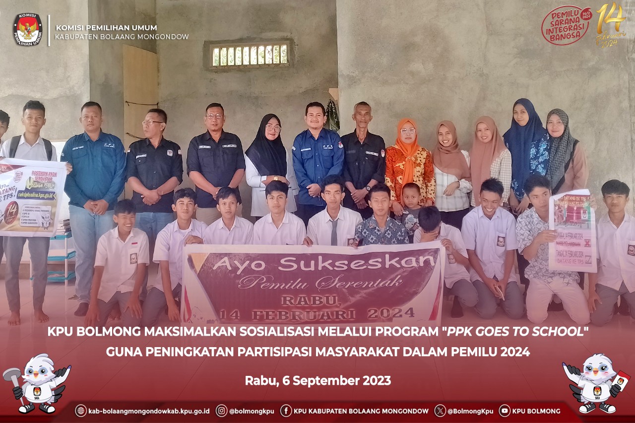 Lolak, kab-bolaangmongondow.kpu.go.id - memerhatikan Peraturan KPU Nomor 3 Tahun 2022 tentang Tahapan dan Jadwal Penyelengaraan Pemilihan Umum Tahun 2024, dan Peraturan KPU Nomor 9 Tahun 2022 tentang Partisipasi Masyarakat Dalam Pemilihan Umum dan Pemilihan Gubernur dan Wakil Gubernur, Bupati dan Wakil Bupati, dan/atau Walikota dan Wakil Walikota, KPU Kabupaten Bolaang Mongondow (Bolmong) gelar sosialisasi “PPK Goes To School” guna peningkatan partisipasi masyarakat dalam Pemilu 2024 (6/9).