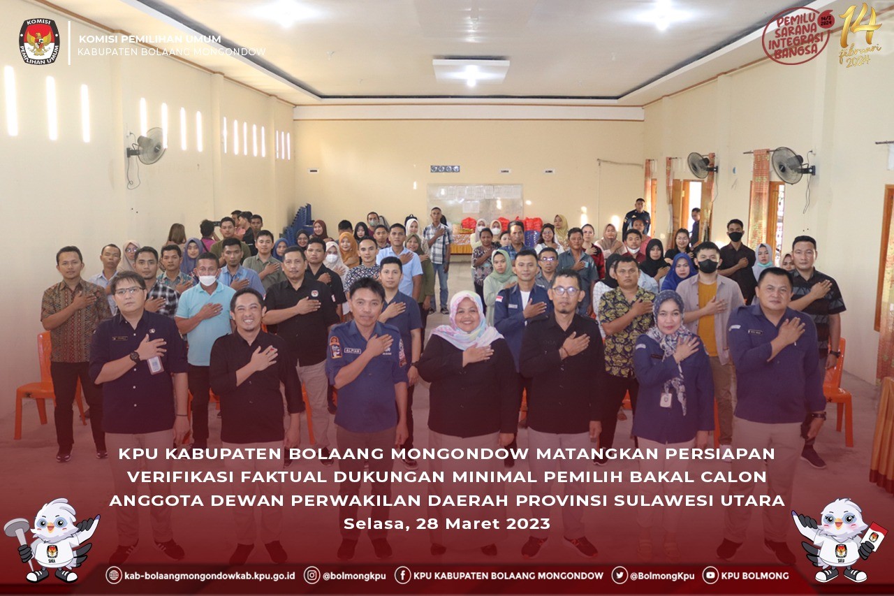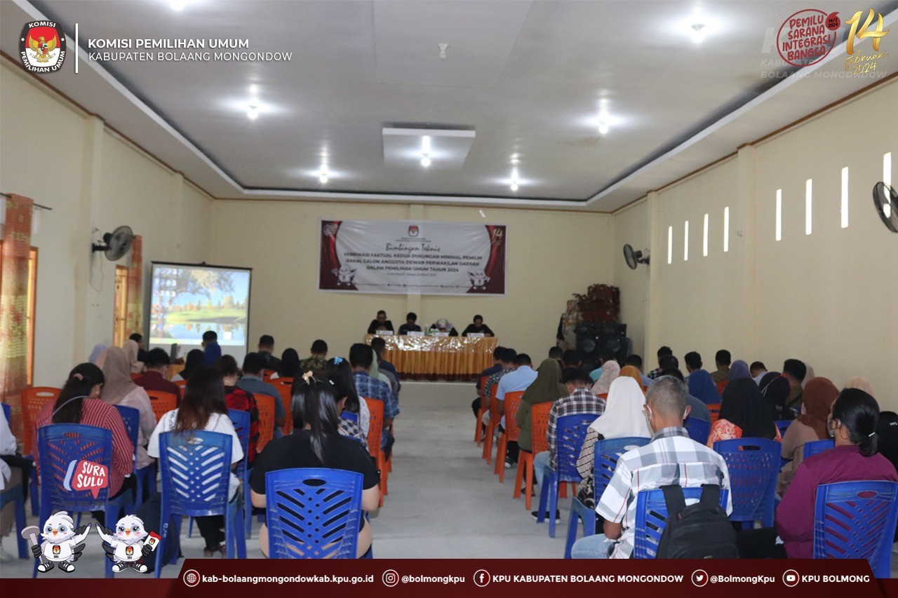Lolak, kab-bolaangmongondow.kpu.go.id - Untuk memantapkan pelaksanaan Verifikasi Faktual Kedua Dukungan Minimal Pemilih Bakal Calon Anggota Dewan Perwakilan Daerah (DPD) Provinsi Sulawesi Utara, KPU Kabupaten Bolaang Mongondow menggelar Bimbingan Teknis (Bimtek) kepada Panitia Pemilihan Kecamatan (PPK) dan Panitia Pemungutan Suara (PPS) se- Kabupaten Bolaang Mongondow pada Selasa, 28 Maret 2023 bertempat di Hotel Atlantik Inobonto.