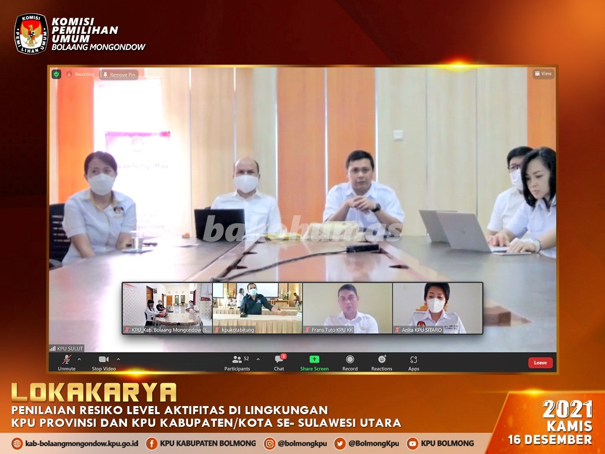 Lolak, Bolmong, kab-bolaangmongondow.kpu.go.id – KPU Kabupaten Bolaang Mongondow mengikuti kegiatan “Lokakarya Penilaian Risiko Level Aktifitas di lingkungan KPU Provinsi dan KPU Kabupaten/Kota se-Sulawesi Utara” (16/12) yang dilaksanakan oleh KPU Provinsi Sulawesi Utara sesuai dengan Undangan Nomor: 455/PW.01/71/2021, setelah tersusunnya Penilaian Risiko Level Entitas KPU Provinsi dan KPU Kabupaten/Kota berdasarkan Pasal 13 Ayat (1) Peraturan Pemerintah Nomor 60 Tahun 2008 tentang Sistem Pengendalian Intern Pemerintah. Kegiatan ini diikuti oleh Ketua dan Anggota KPU Kabupaten Bolaang Mongondow, Kepala Sub Bagian Program dan Data, Kepala Sub Bagian Hukum dan Staf Pelaksana sebagai Operator.