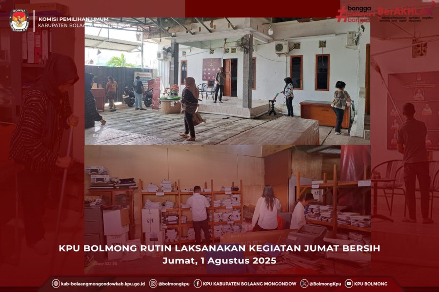 Lolak, kab-bolaangmongondow.kpu.go.id - Kegiatan Jumat Bersih merupakan rutinitas yang dilaksanakan KPU Kabupaten Bolaang Mongondow (Bolmong) setiap Minggunya. Giat ini merupakan bentuk kepedulian dan tanggung jawab bersama untuk menciptakan lingkungan yang bersih dan nyaman dalam menjalankan tugas pekerjaan. Karena dengan terwujudnya kebersihan kantor juga berkontribusi meningkatnya produktivitas kerja. Dengan lingkungan yang bersih, tentu semangat kerja juga akan meningkat.