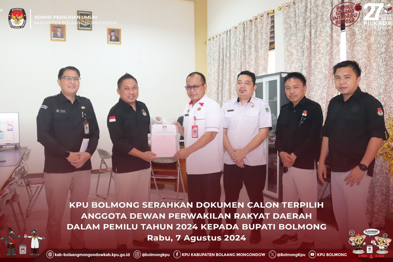 KPU BOLMONG SERAHKAN DOKUMEN CALON TERPILIH ANGGOTA DEWAN PERWAKILAN RAKYAT DAERAH DALAM PEMILU TAHUN 2024 KEPADA BUPATI BOLMONG