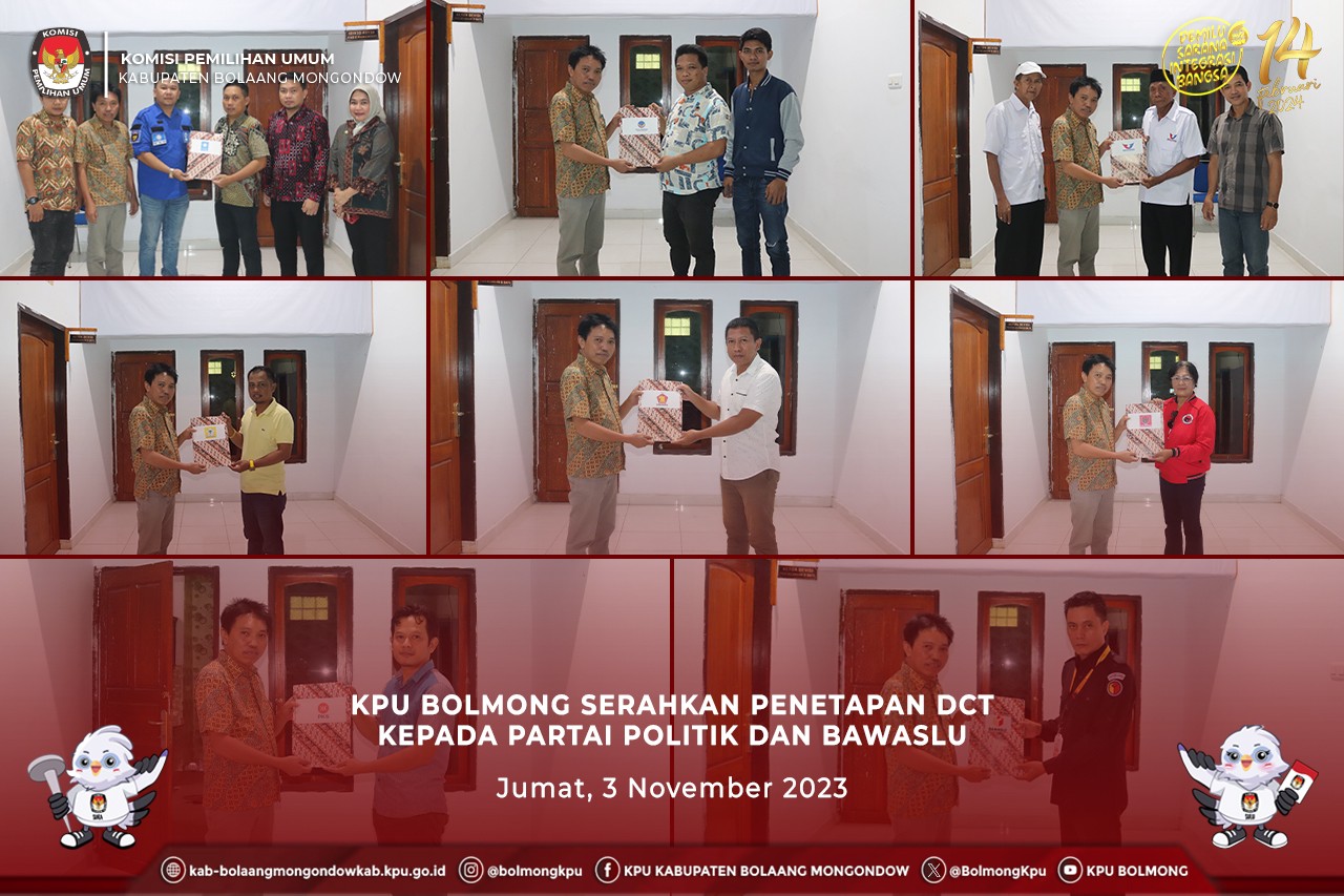 Penyerahan ini diserahkan langsung oleh Ketua dan Anggota KPU Bolmong, dan diterima oleh Perwakilan dari Partai Amanat Nasional, Partai NasDem, Partai Perindo, Partai Golkar, Partai Gerindra, Partai Demokrasi Indonesia Perjuangan dan Partai Keadilan Sejahtera. Penetapan DCT juga turut diserahkan ke Bawaslu Bolmong.