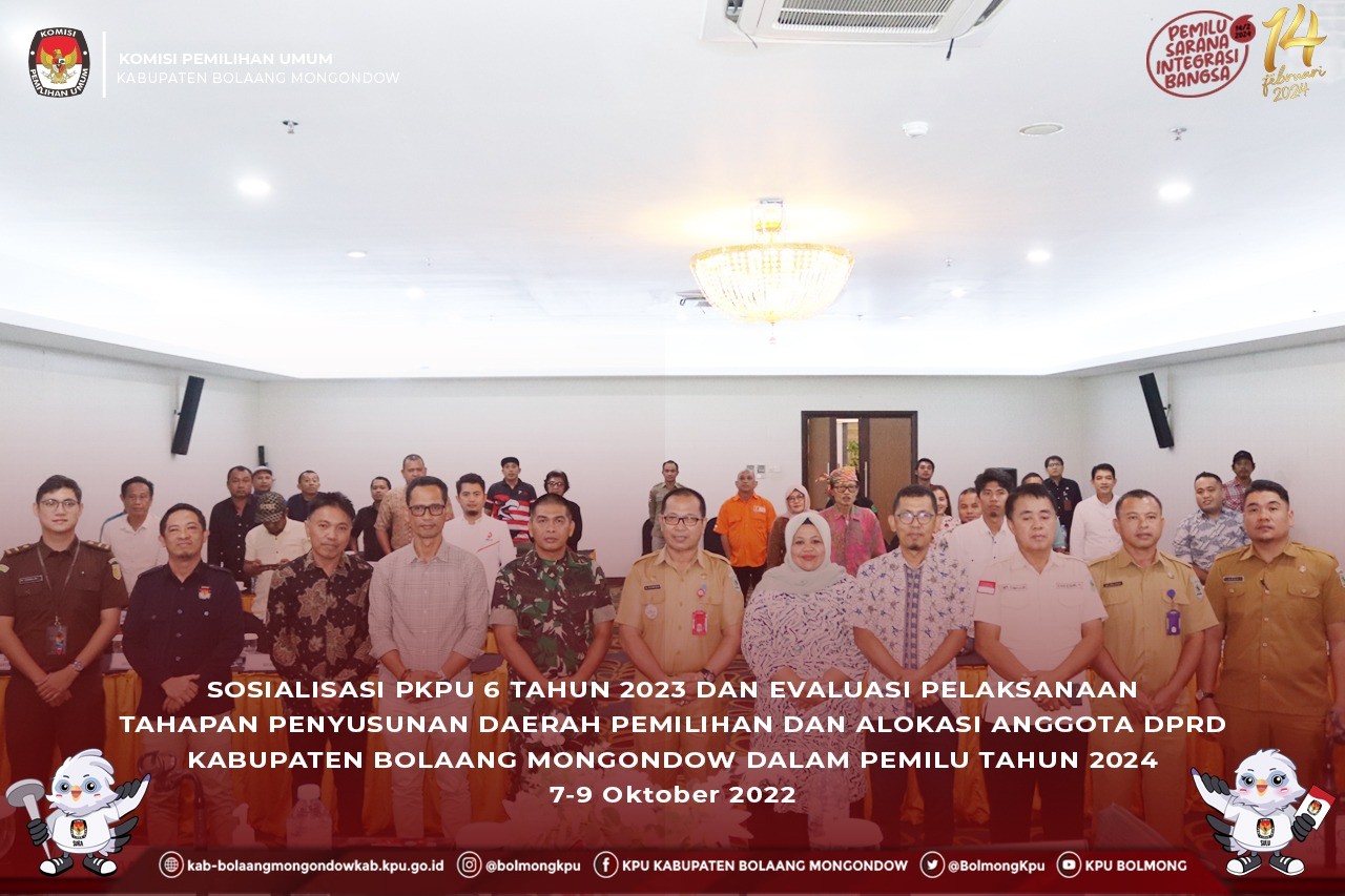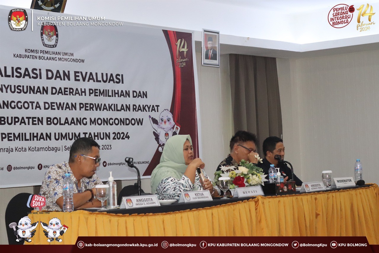 Lolak, kab-bolaangmongondow.kpu.go.id - Selasa (21/3), KPU Kabupaten Bolaang Mongondow menggelar Sosialisasi dan Evaluasi Tahapan Penyusunan Daerah Pemilihan dan Alokasi Kursi Anggota DPRD Kabupaten Bolaang Mongondow dalam Pemilu Tahun 2024. Kegiatan ini merupakan tindak lanjut dari telah ditetapkannya Peraturan KPU Nomor 6 Tahun 2023 tentang Daerah Pemilihan dan Alokasi Kursi Anggota Dewan Perwakilan Rakyat, Dewan Perwakilan Rakyat Daerah Provinsi, dan Dewan Perwakilan Rakyat Daerah Kabupaten/Kota Dalam Pemilihan Umum Tahun 2024.