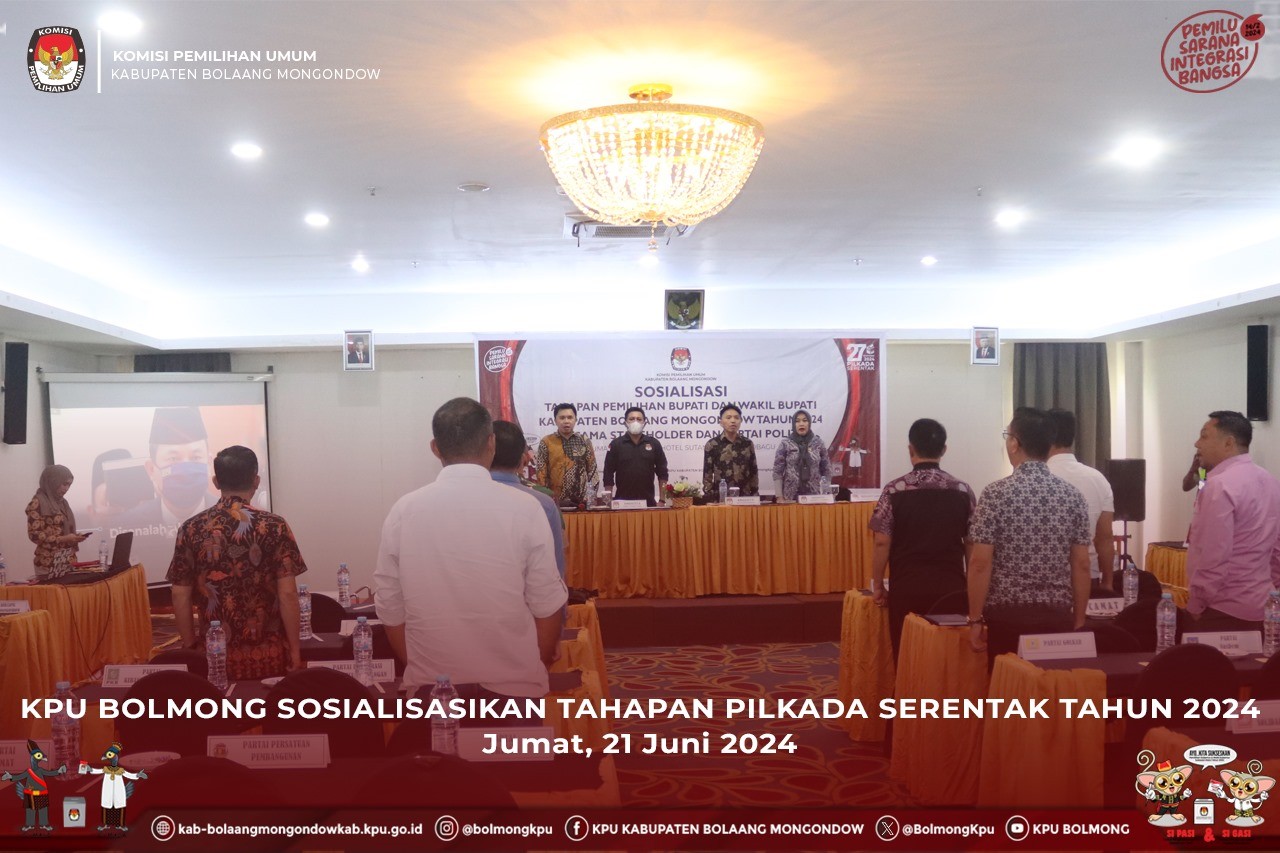 Lolak, kab-bolaangmongondow.kpu.go.id - Jumat (21/6/2024), Komisi Pemilihan Umum (KPU) Kabupaten Bolaang Mongondow (Bolmong) melaksanakan sosialisasi tahapan Pemilihan Bupati dan Wakil Bupati Bolaang Mongondow. Sosialisasi mencakup Peraturan KPU Nomor 2 Tahun 2024 tentang Tahapan dan Jadwal Pemilihan Gubernur dan Wakil Gubernur, Bupati dan Wakil Bupati, serta Walikota dan Wakil Walikota tahun 2024.