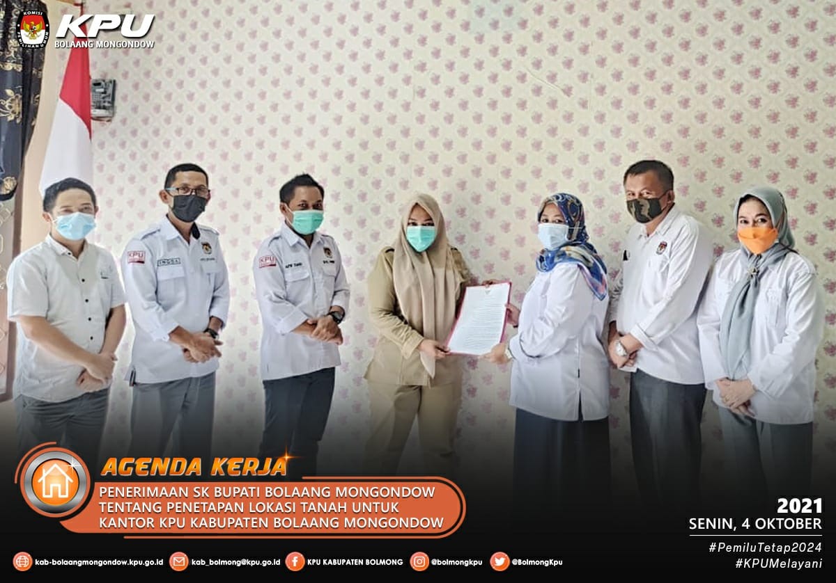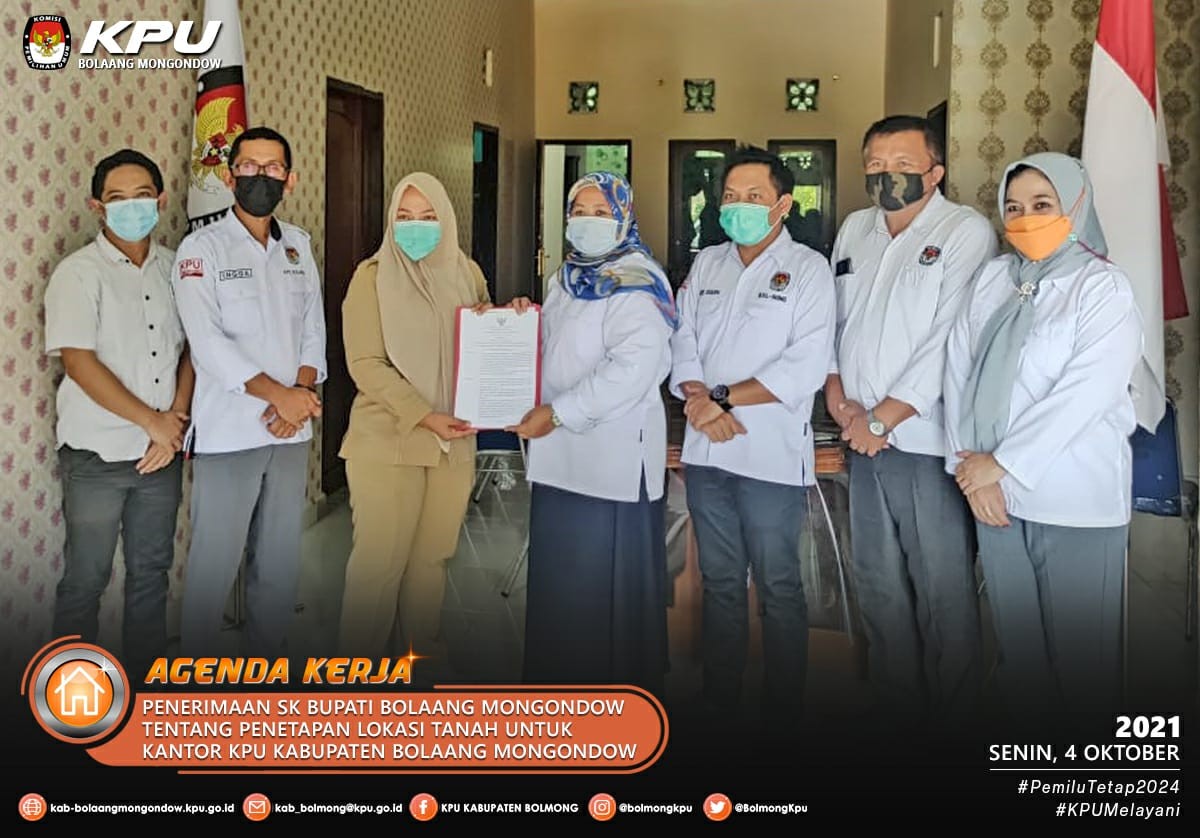 Penunjukan lokasi ini ditetapkan dalam Surat Keputusan Bupati Bolaang Mongondow Nomor 297 Tahun 2021 tentang Penetapan Lokasi Kantor Komisi Pemilihan Umum Daerah Kabupaten Bolaang Mongondow yang diserahkan oleh Layana Mokoginta, ST selaku Kepala Bidang Tata Ruang Dinas Pekerjaan Umum dan Penataan Ruang Kabupaten Bolaang Mongondow kepada Ketua KPU, Lilik Mahmudah pada, Senin (4/10) di kantor KPU Kabupaten Bolaang Mongondow.