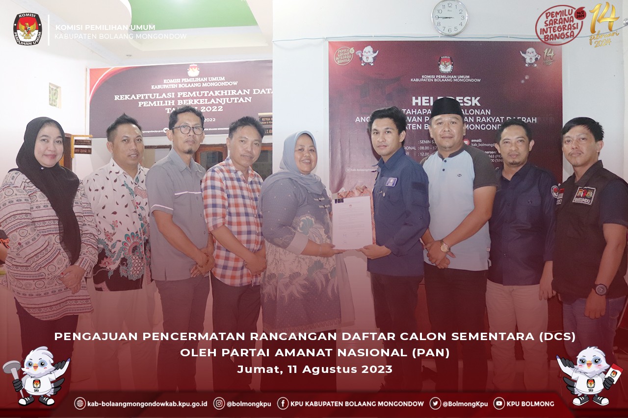 Lolak, kab.bolaangmongondow.kpu.go.id – Partai Amanat Nasional (PAN) Kabupaten Bolaang Mongondow (Bolmong), Jumat (11/8/2023) mengajukan Pencermatan Rancangan Daftar Calon Sementara (DCS) Bakal Calon Anggota DPRD Kabupaten pada Pemilu Tahun 2024.