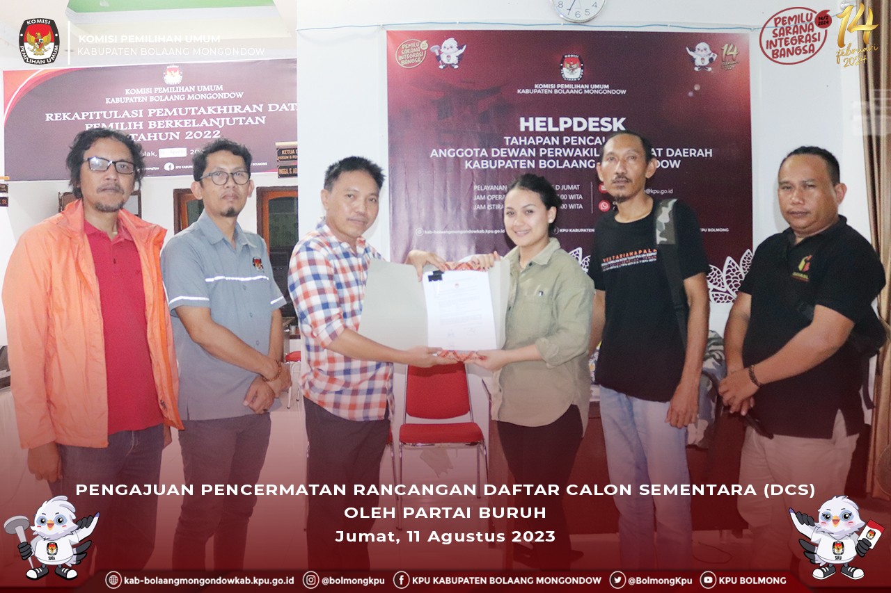 Lolak, kab-bolaangmongondow.kpu.go.id - Partai Buruh Kabupaten Bolaang Mongondow (Bolmong), Jumat (11/8/2023) mengajukan Pencermatan Rancangan Daftar Calon Sementara (DCS) Bakal Calon Anggota DPRD Kabupaten pada Pemilu Tahun 2024.