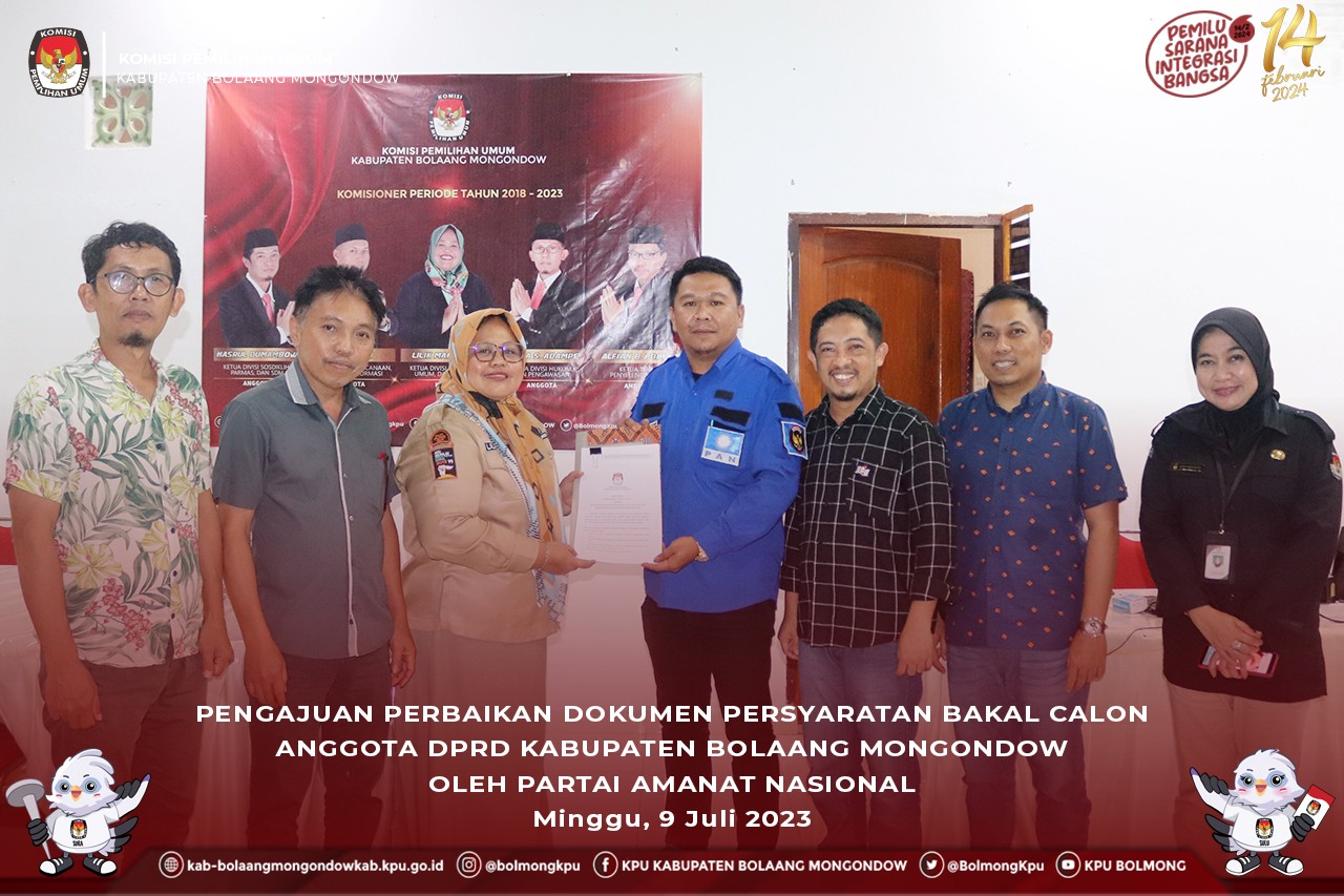 Lolak, kab-bolaangmongondow.kpu.go.id - Minggu (9/7), Partai Amanat nasional (PAN) Kabupaten Bolaang Mongondow (Bolmong) mengajukan Perbaikan Dokumen Persyaratan Bakal Calon Anggota DPRD Kabupaten pada Pemilu Tahun 2024, Minggu (9/7/2023) di Kantor KPU Bolmong.